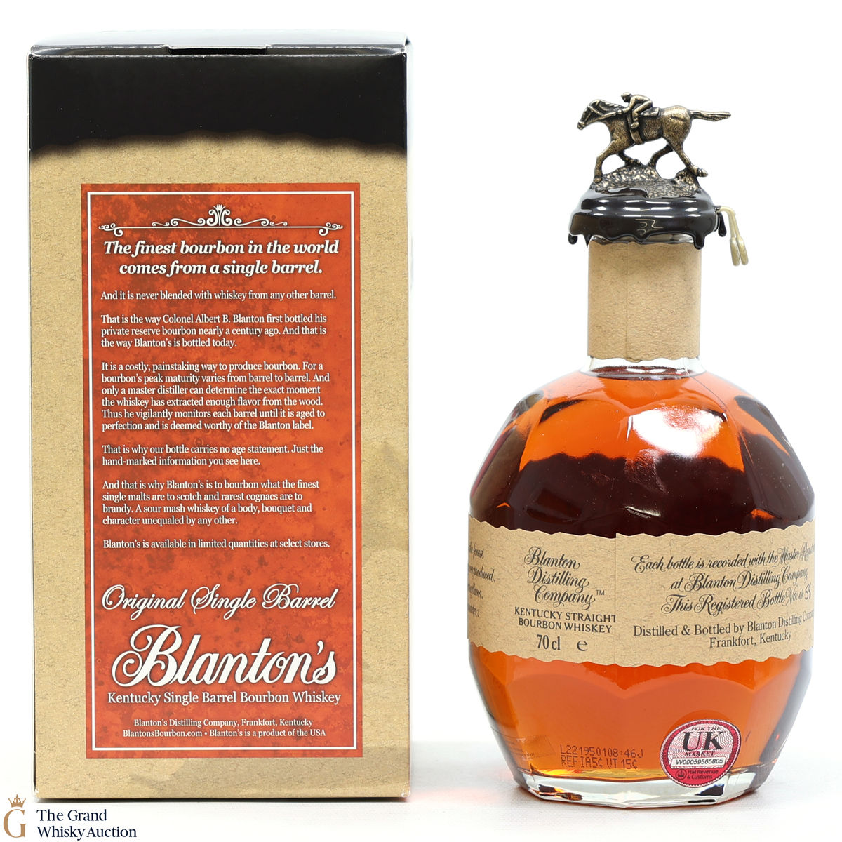 PLEASE NOTE: The wax seal on Blanton's bottles are prone to cracking in transit due to their design. Therefore, as stated in our T&C’s, we do not and will not accept liability should the seal be breached, broken, split or leak in transit. Additionally, please know due to the design of the internal cardboard packaging that surrounds the top of the bottles, it too may be torn. By bidding on this lot you have understood this to be true. Insurance is for complete breakage or loss in transit only.
