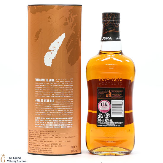 A bottle of Jura 10 Year Old. Originally built in 1810, the distillery fell into disrepair and wasn't revived until the 1960's by two local estate owners.
