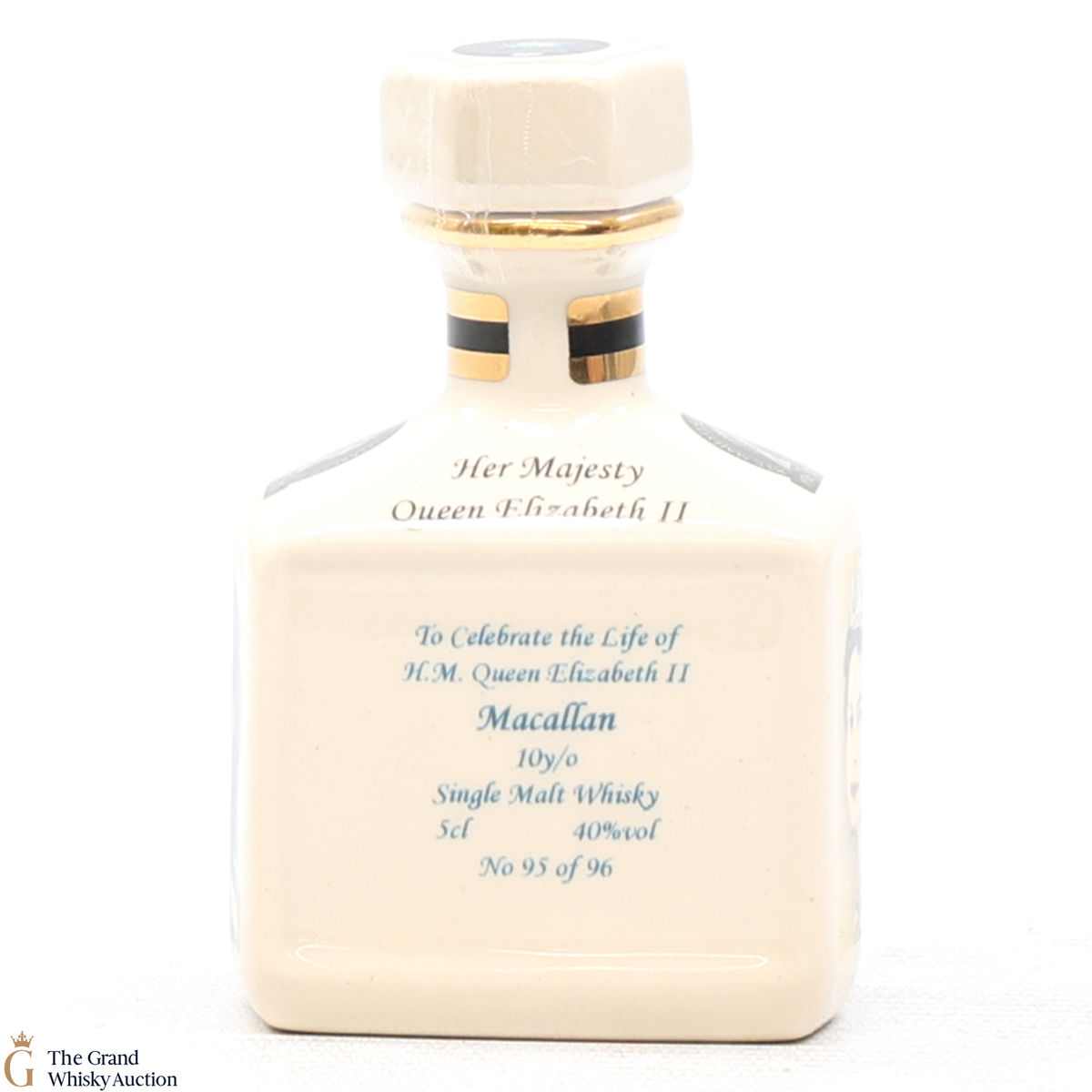 This is a mini decanter to celebrate the life of H.M Queen Elizabeth II. Filled with Macallan Single Malt Whisky, this is one of only 96 5cl bottles.