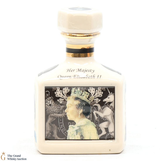 This is a mini decanter to celebrate the life of H.M Queen Elizabeth II. Filled with Macallan Single Malt Whisky, this is one of only 96 5cl bottles.