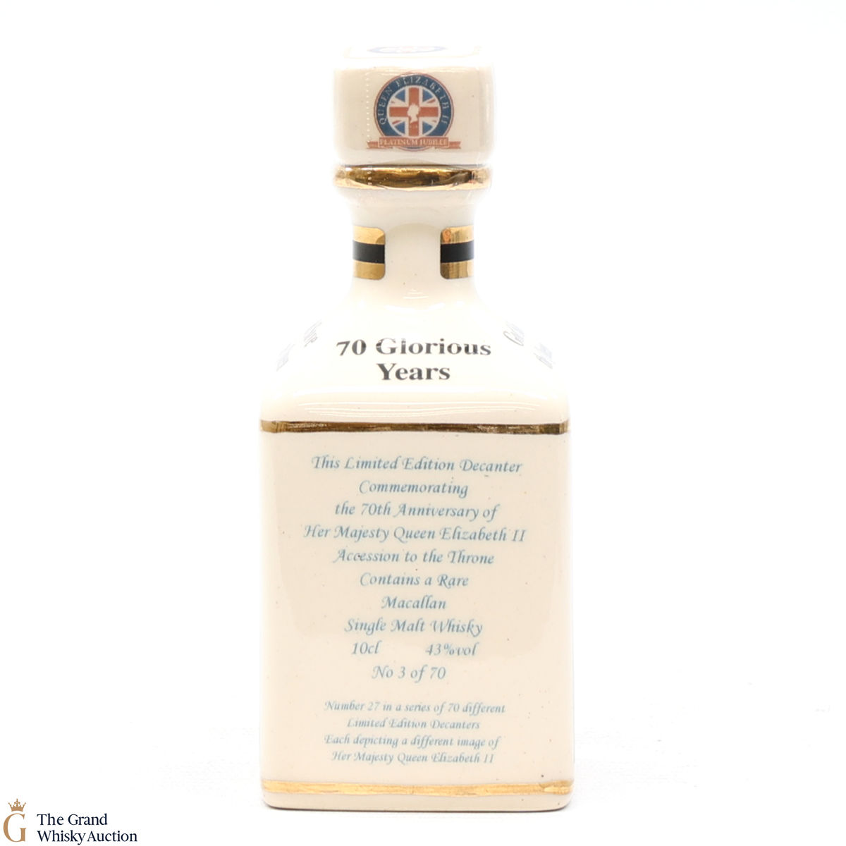 A mini decanter commemorating the 70th Anniversary of Her Majesty Queen Elizabeth II Accession to the Throne. Filled with a rare Macallan, there were only 70 full sets released which consisted of 70 different bottles.