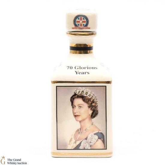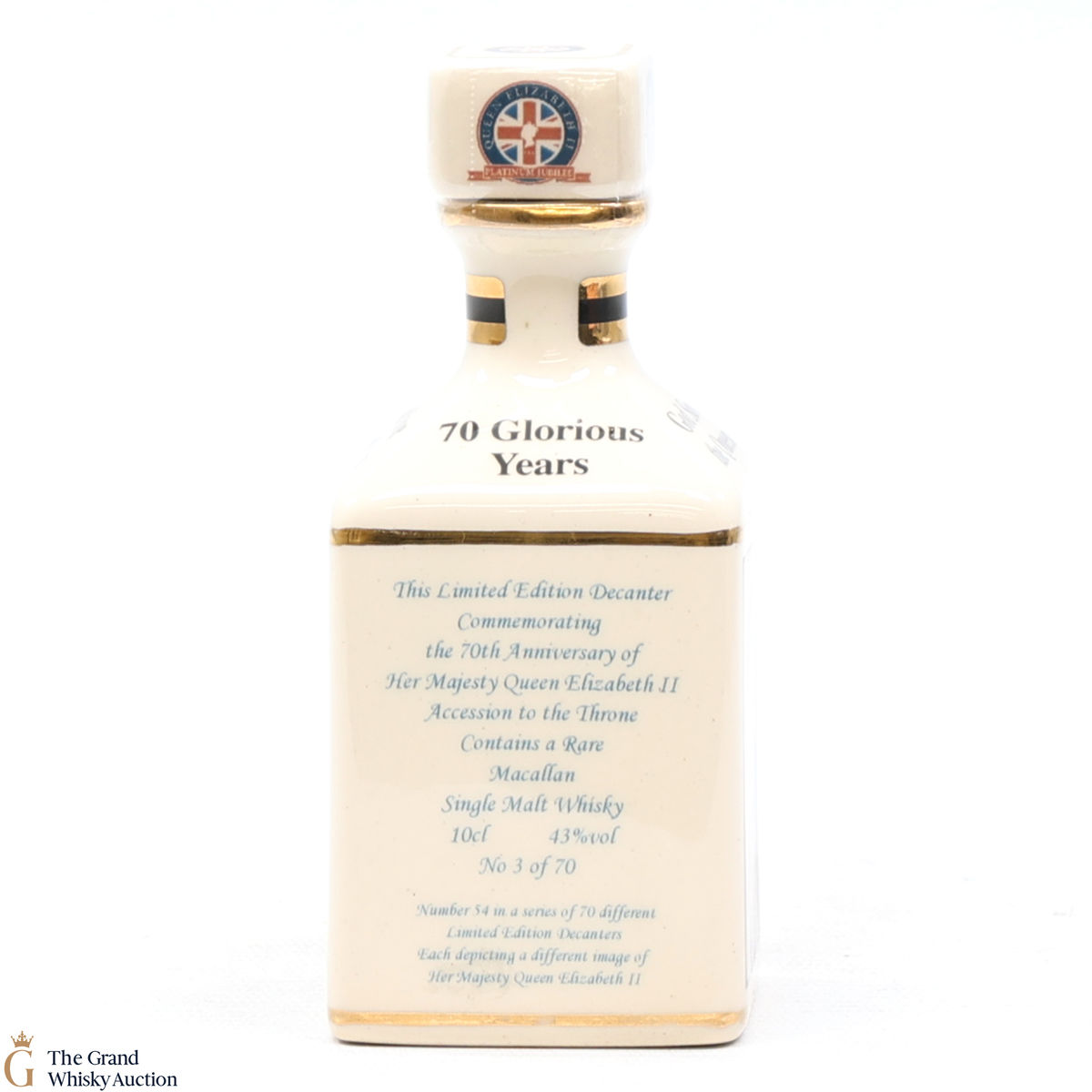 A mini decanter commemorating the 70th Anniversary of Her Majesty Queen Elizabeth II Accession to the Throne. Filled with a rare Macallan, there were only 70 full sets released which consisted of 70 different bottles.