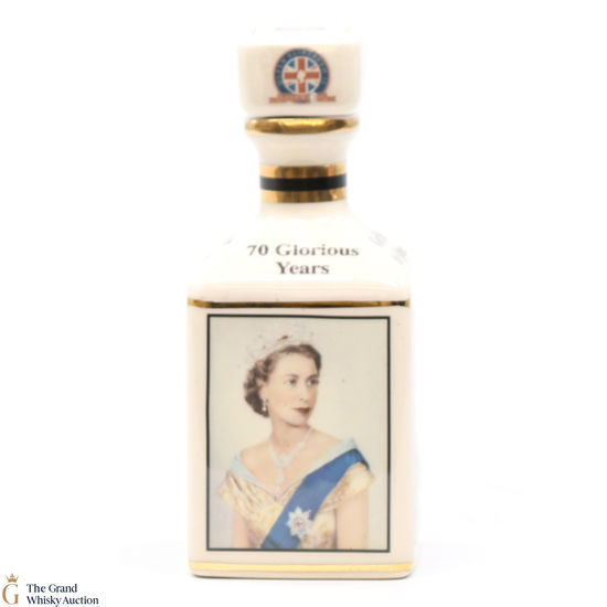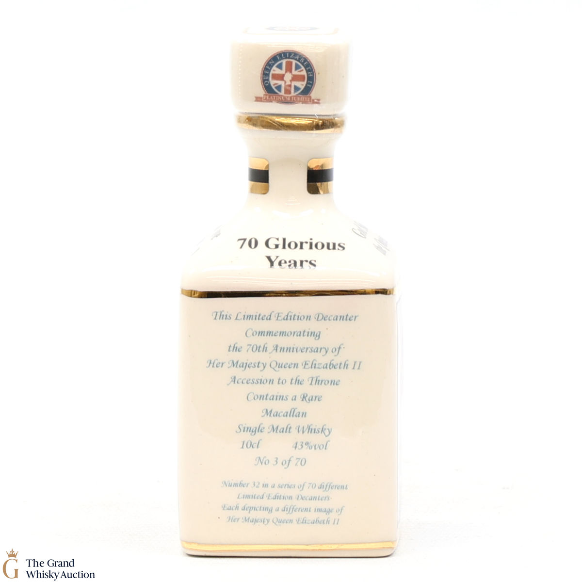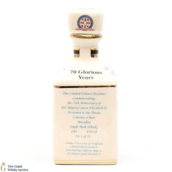 A mini decanter commemorating the 70th Anniversary of Her Majesty Queen Elizabeth II Accession to the Throne. Filled with a rare Macallan, there were only 70 full sets released which consisted of 70 different bottles.