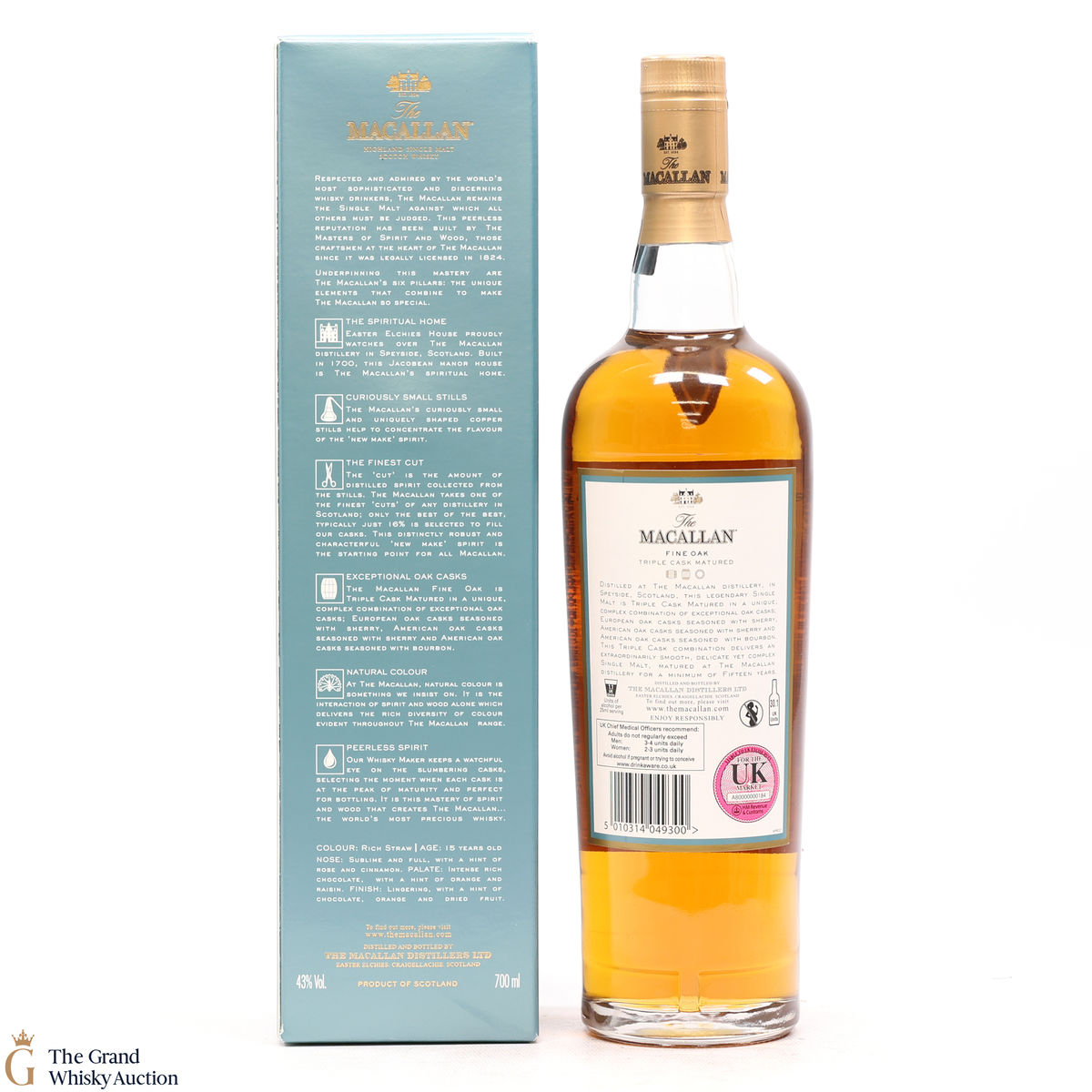 This 15 year old single malt is part of Macallan's Fine Oak, triple cask matured range. It has been matured for fifteen years in three oak cask types; Europen oak seasoned with sherry, American oak seasoned with sherry and American oak seasoned with bourbon. It is 'a rich straw whisky' with notes of cinnamon, rich chocolate and dried fruits. This bottle is an import.