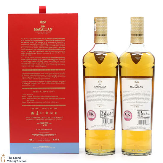 With bespoke label designs, this is an eye-catching limited-edition release twin pack containing 2 x 70cl bottles of The Macallan 12-year-old Triple Cask single malt whisky.