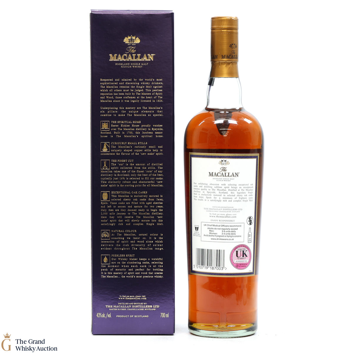 This Macallan 18 Year Old Single malt was bottled in 2017 in Speyside Scotland. This classic was one of the last bottles in this shape. It is now becoming rarer and a staple item in a collector's cellar!