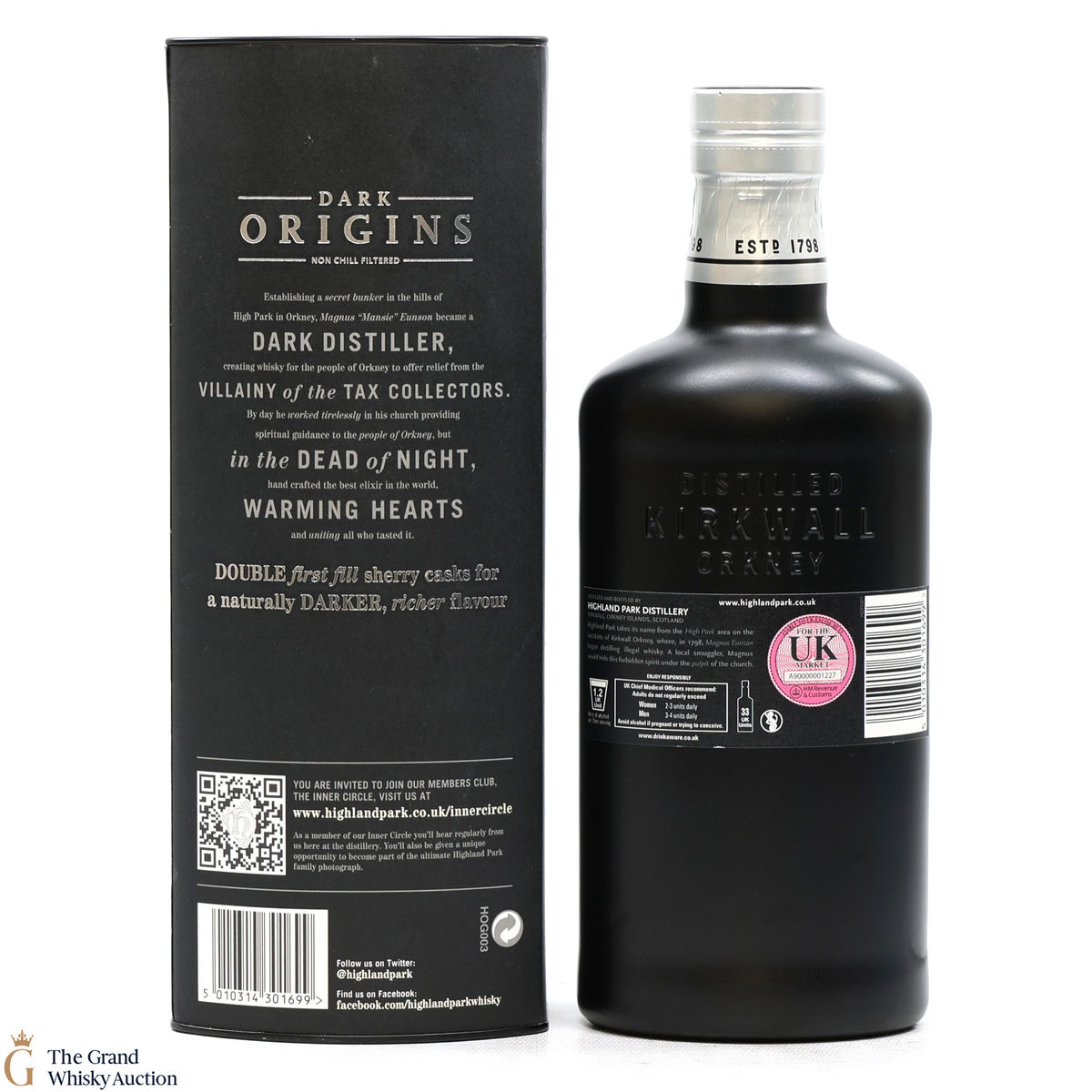 Highland Park Dark Origins was created in memory of the distillery founder Magnus Eunson's illicit distilling on Orkney, back before the distillery was even founded in 1798. Magnus worked as a butcher and church official by day, but by night he was a legendary whisky smuggler and distiller outwitting the exciseman.