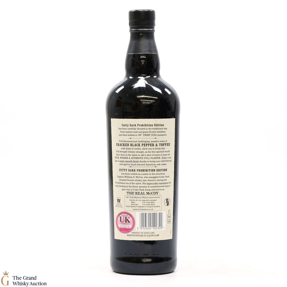 This small batch Prohibition edition of Cutty Sark has been crafted as a salute to the notorious Captain William S. McCoy, who smuggled Cutty Shark blended Scotch whisky into America during the Prohibition era of the 1920s. Bottled at 50% and housed in a black glass bottle with a cork seal, which was typical of bottles during the era.