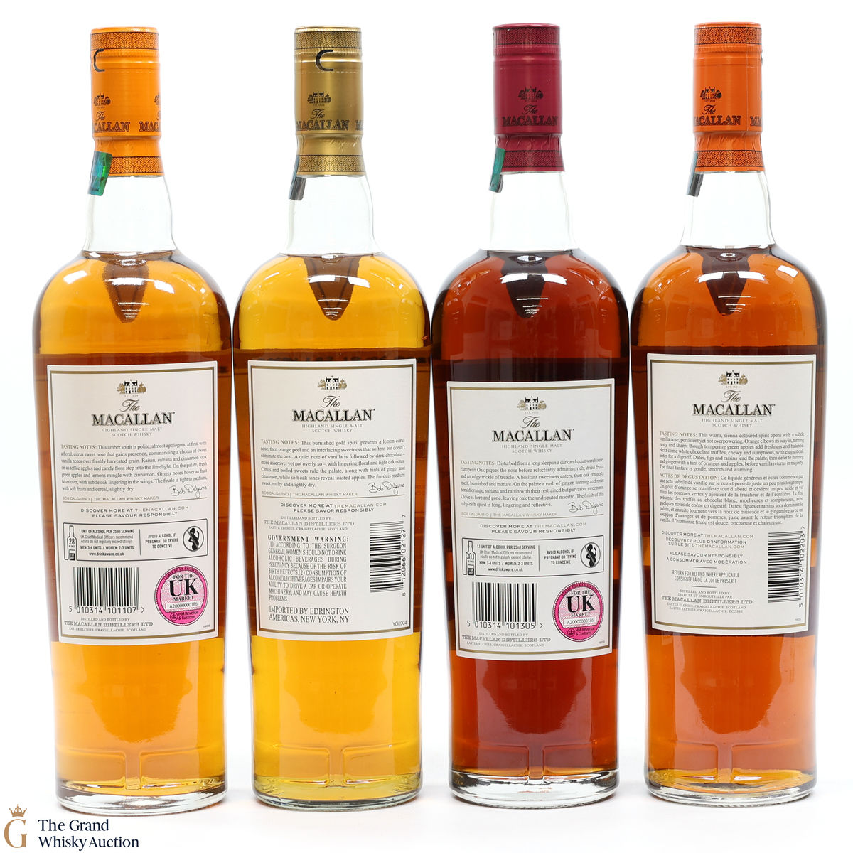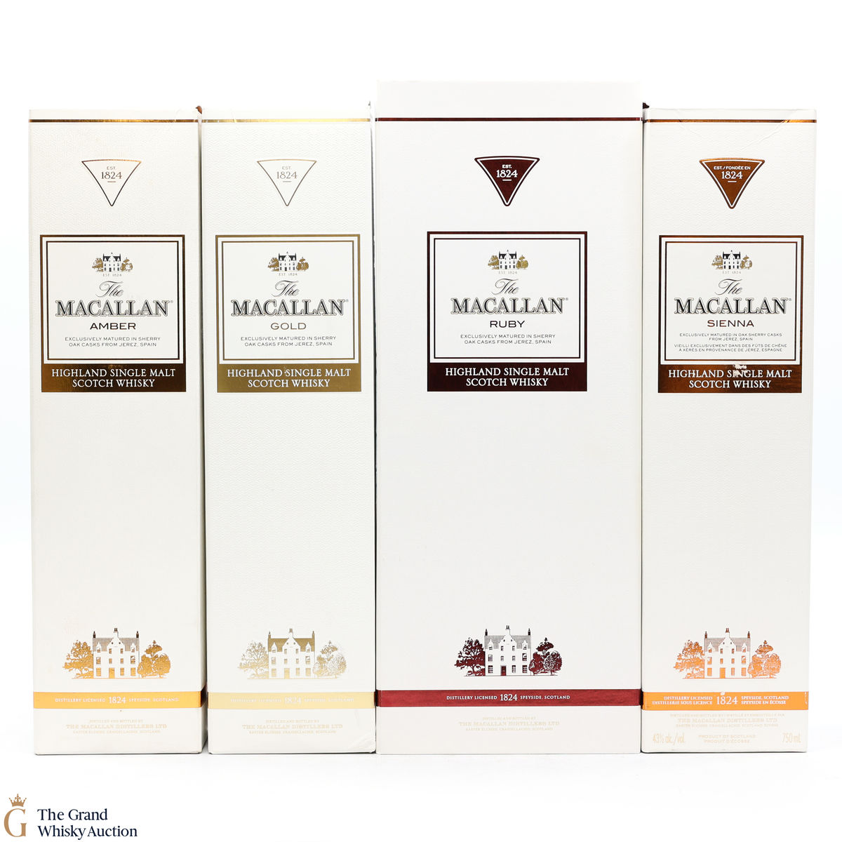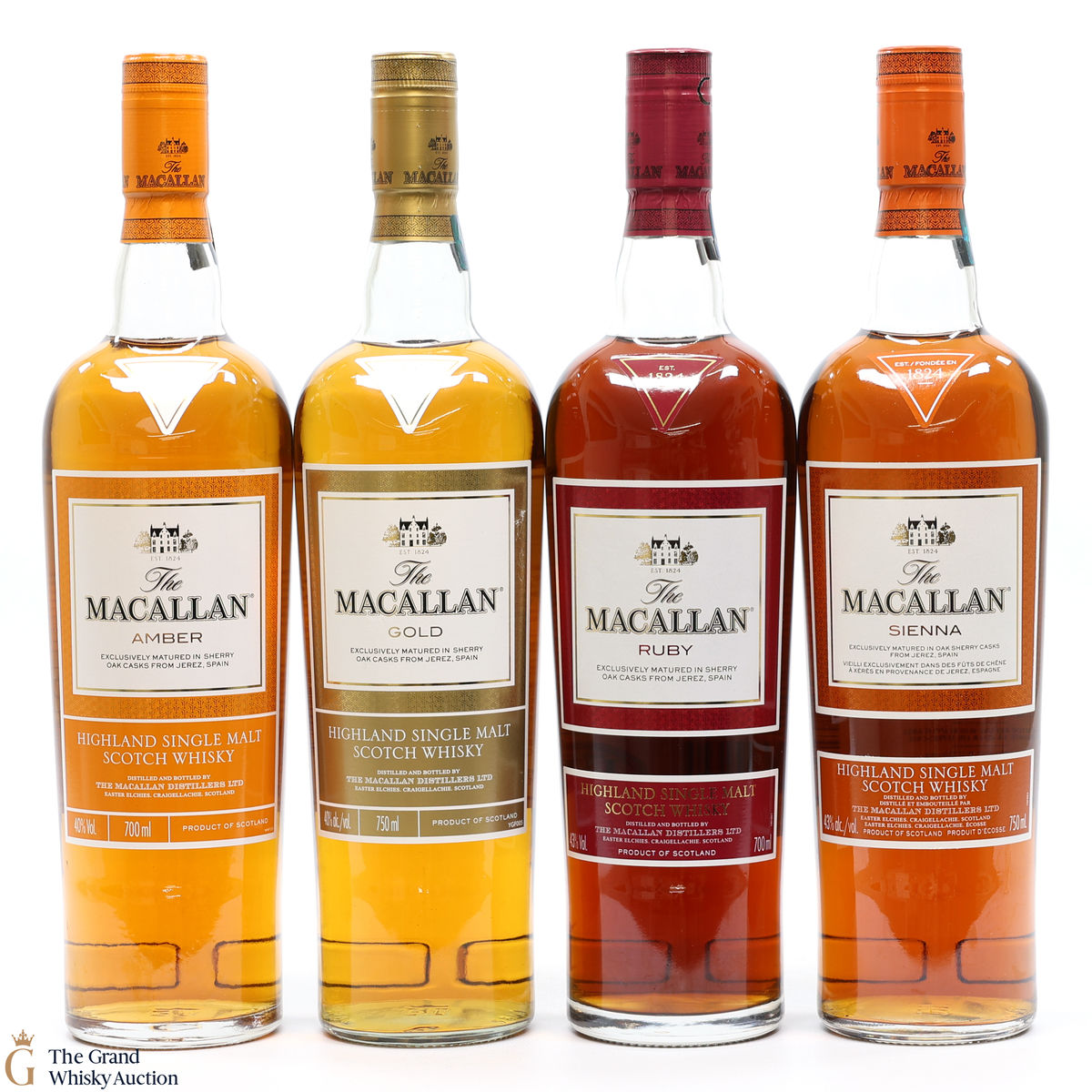 - Macallan - Sienna: a no age statement bottling. Matured in top quality sherry casks, this single malt is named Sienna to represent the naturally occurring pigment - referring not only to the hue of this expression but to the fact that The Macallan's whiskies are all released with no added colouring. 43% ABV, 70cl.