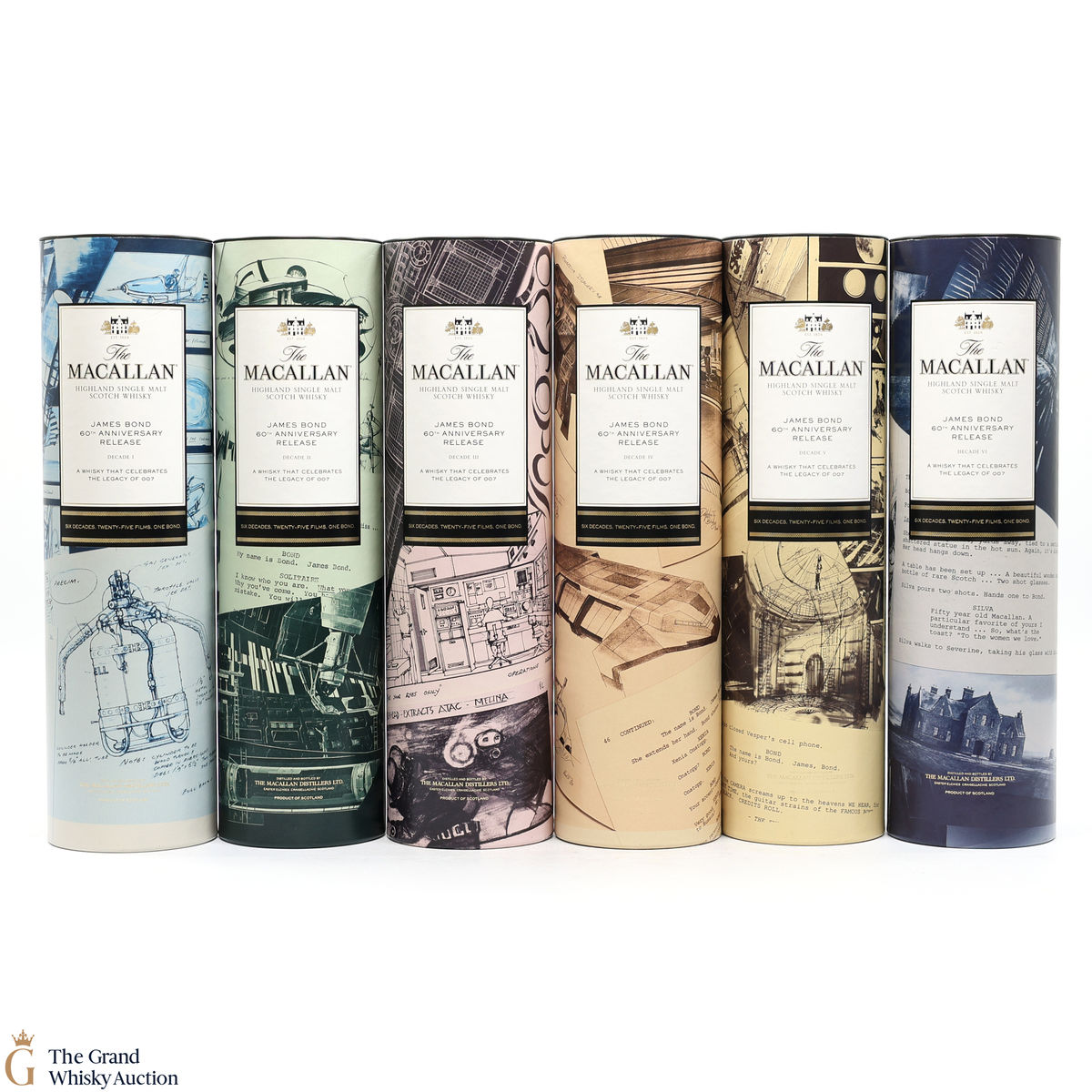 The remarkable James Bond 60th Anniversary Release is a celebration of 007 and The Macallan as modern innovators linked by their Scottish heritage. Each bottle’s packaging features an original illustrative design and colour to denote the decade it represents.