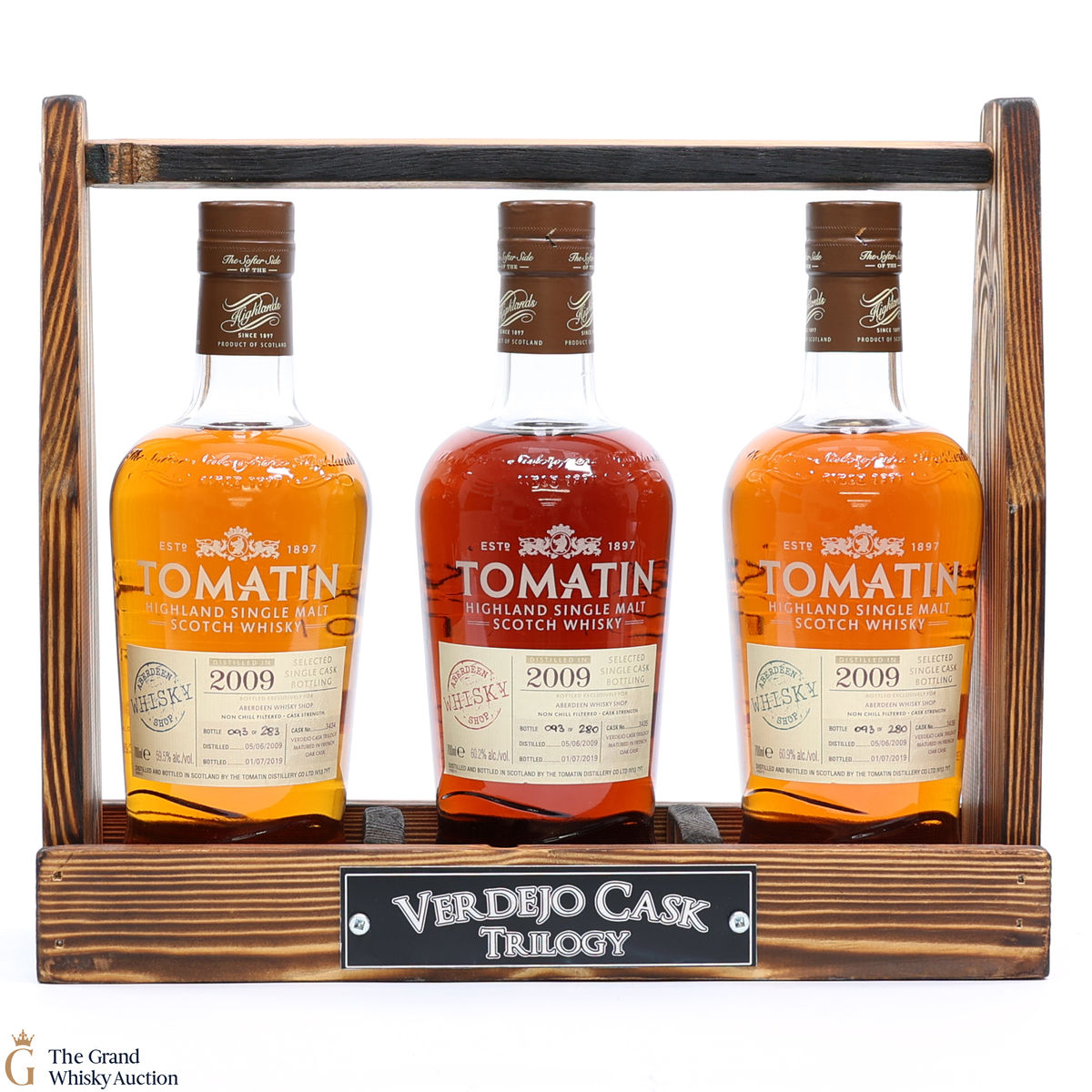 The Tomatin Verdejo Cask Trilogy is the result of a partnership between the Tomatin Distillery and the Aberdeen Whisky Shop. The three releases have been matured in different Verdejo Spanish white wine casks, which is a world first. They were all bottled at cask strength. This lot includes: