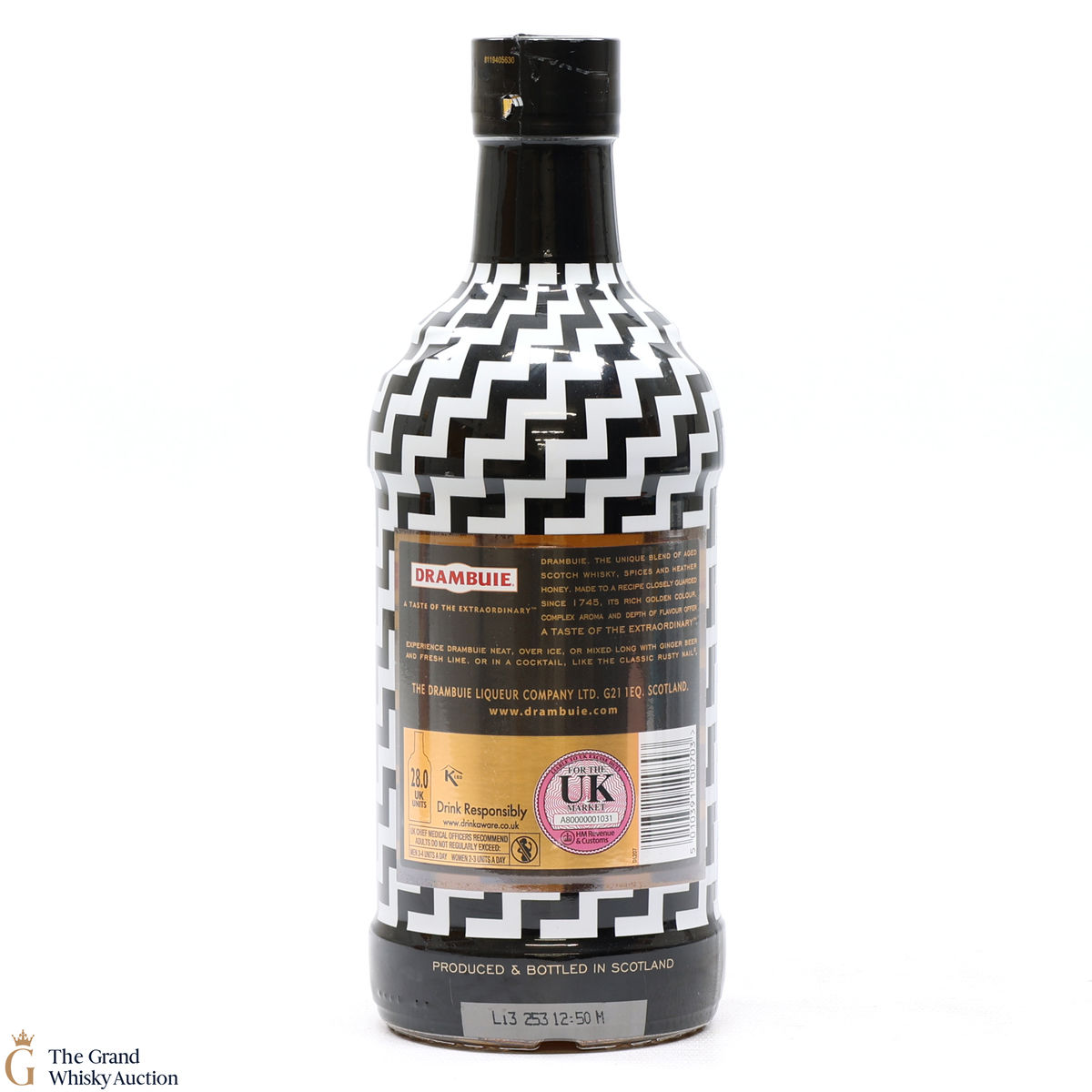 A 70cl bottling of Drambuie Whisky Liqueur, bottled for Christmas 2013, this iss a black and white zig-zag decorated bottle.