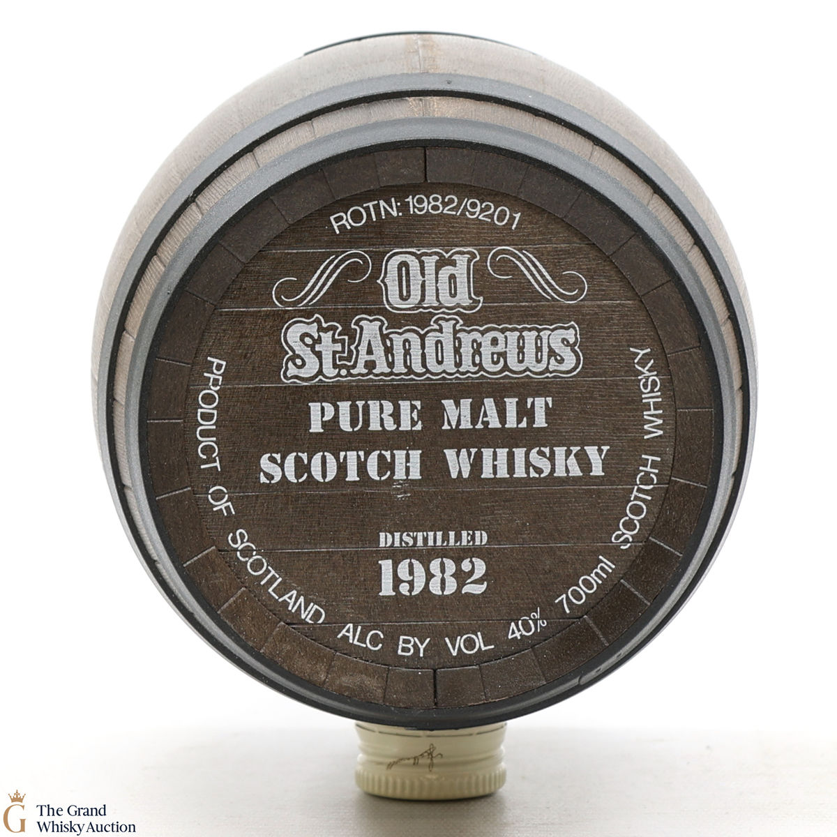 A barrel shaped bottling of Old St Andrews 1982 Pure Malt Scotch whisky (70cl), bottled in the early 1990s.