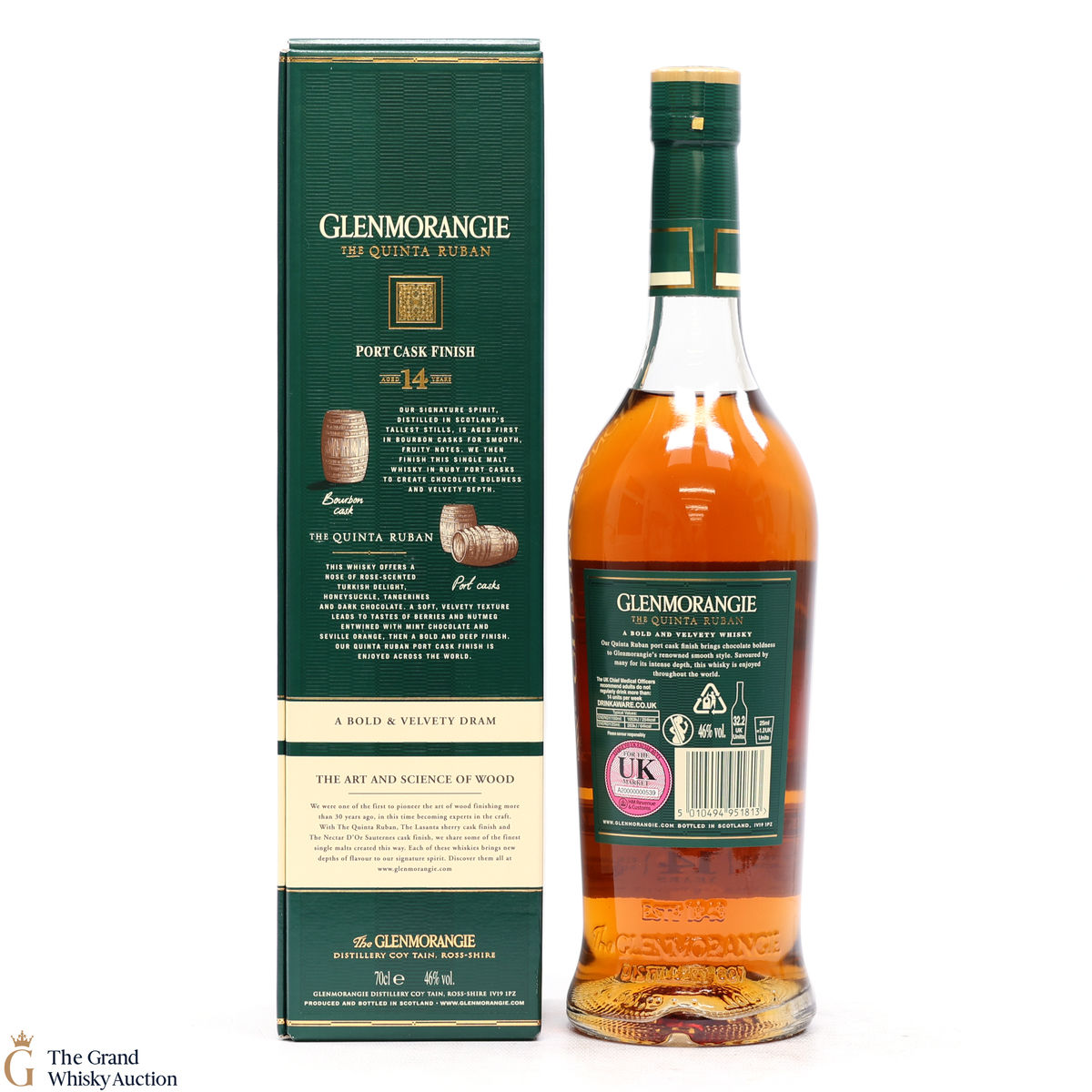 Glenmorangie Quinta Ruban is matured in bourbon casks before finishing in the finest Ruby Port casks from the "Quintas" or wine estates of Portugal. Ruban is Gaelic for Ruby.