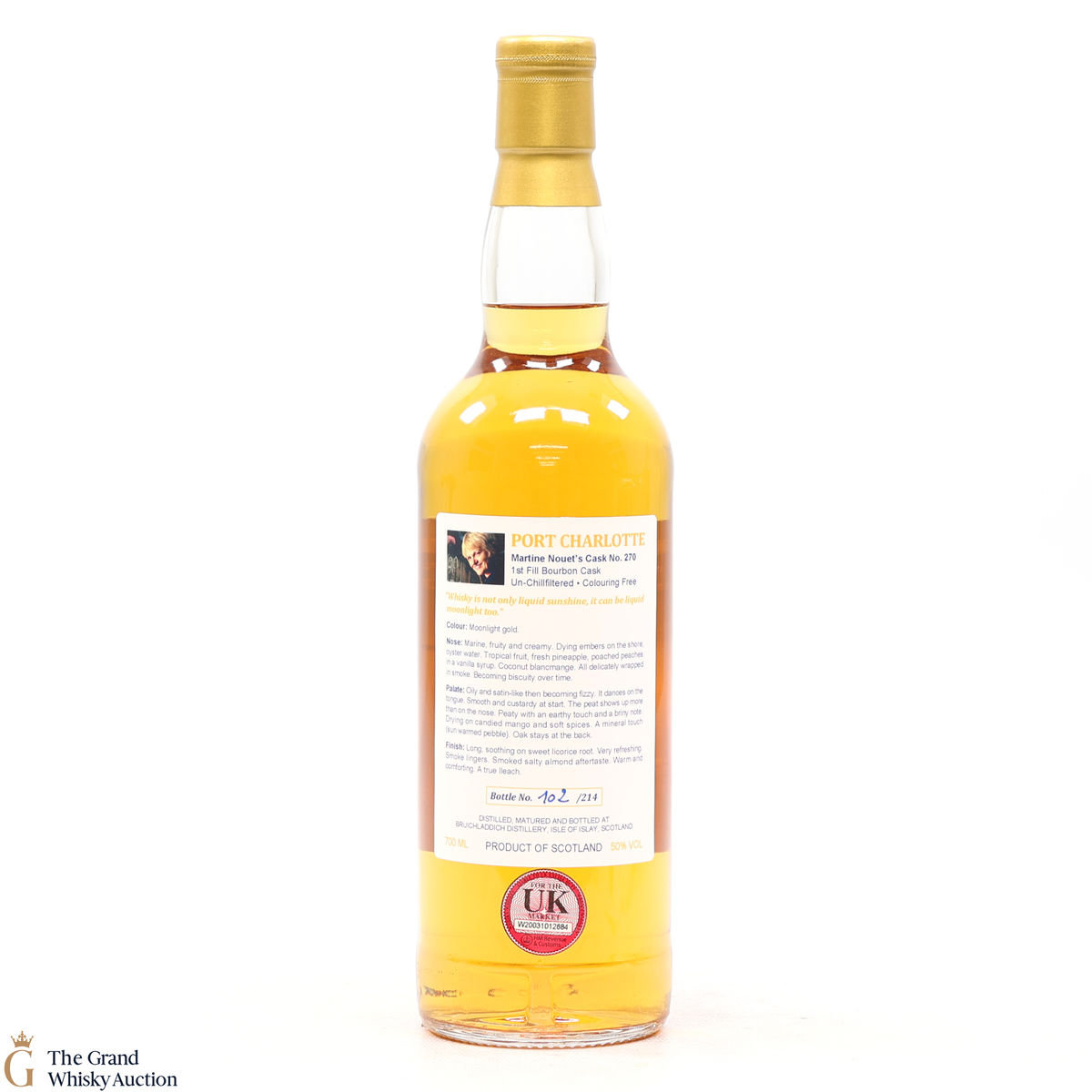 This Port Charlotte 15 Year Old was distilled in 2001 and matured in a 1st fill bourbon cask #270 until October 2016. A private bottling; The Queen of the Still Private Cask from Martine Nouet's cask #270. One of 214 bottles.