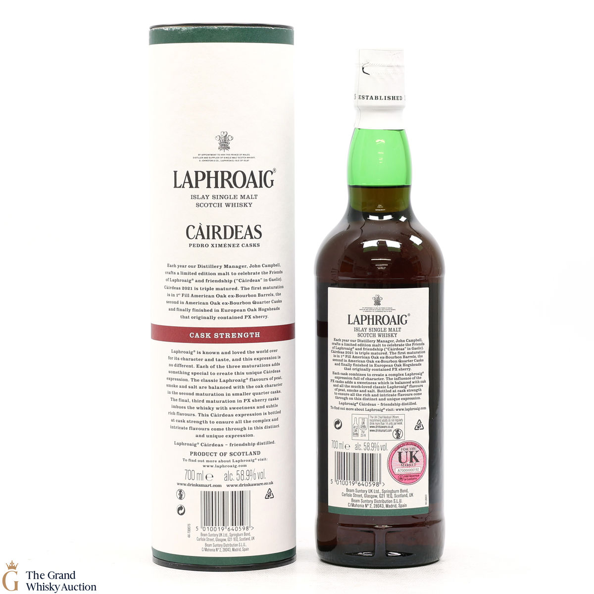 The 2021 edition of Laphroaigs Cairdeas series was first matured in a 1st fill American oak ex-bourbon barrel, then in an American oak ex-bourbon quarter cask before finally being finished in European PX sherry casks. Bottled at the cask strength of 58.9% ABV in 2021 to celebrate the Friends of Laphroaig.