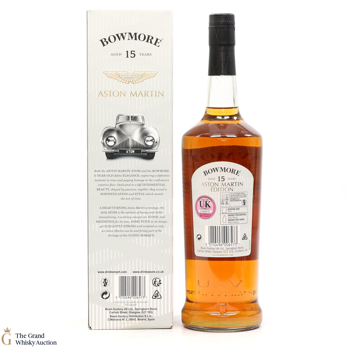 Distilled at the Bowmore Distillery in Islay, this 15 year old single malt was married in first fill bourbon casks. This is the first edition bottling to celebrate the collaboration with Aston Martin, named Dark and Intense it is available exclusively to global travellers. Each of the three editions of the Aston Martin Series features a different car, the 15 has the ATOM.