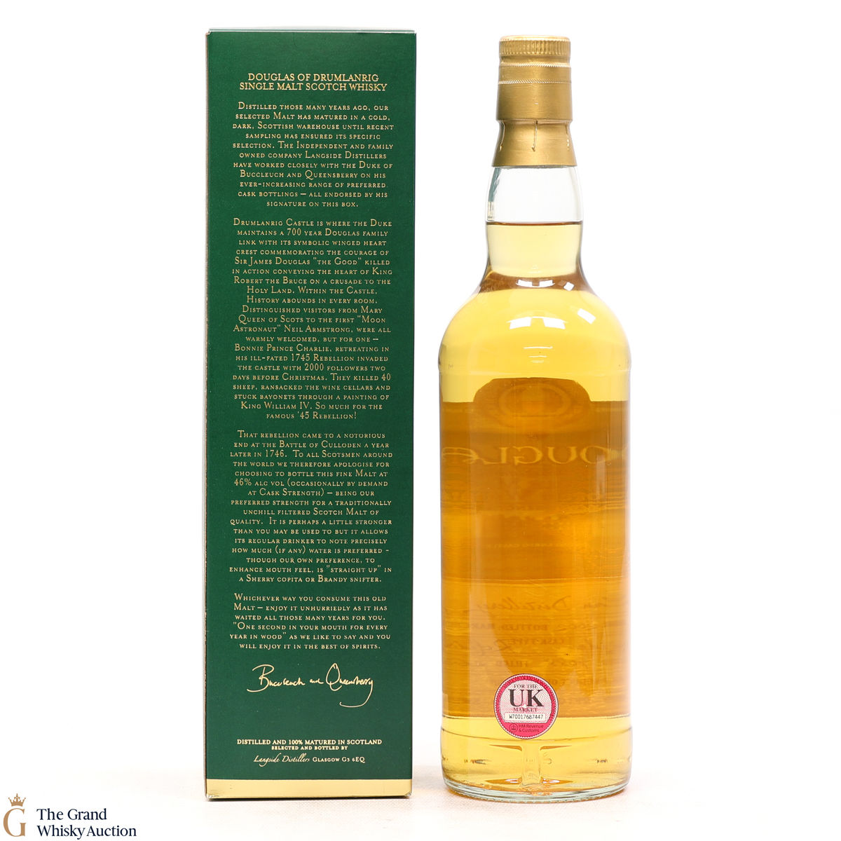 Due to the various ages of bottles and their seals, the condition of liquid is at the buyer's discretion and no claim can be lodged against failure/leakage in transit. Loss and breakage cover is available at 3% of the hammer price as standard. If the lot is not insured, no claim can be lodged against the courier or The Grand Whisky Auction for breakage or loss in transit.