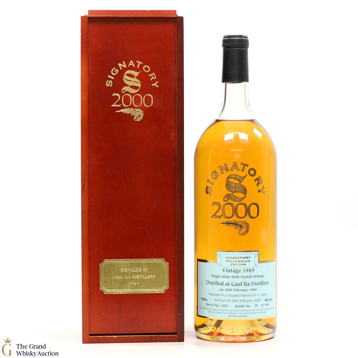 A vintage single malt distilled at Caol Ila Distillery on Islay on the 28th of February 1989. Matured in a bourbon cask for 11 years and bottled at 43% on the 28th of February 2000 as a signatory Millenium Edition. Drawn from cask #1021 is one bottle of 148.