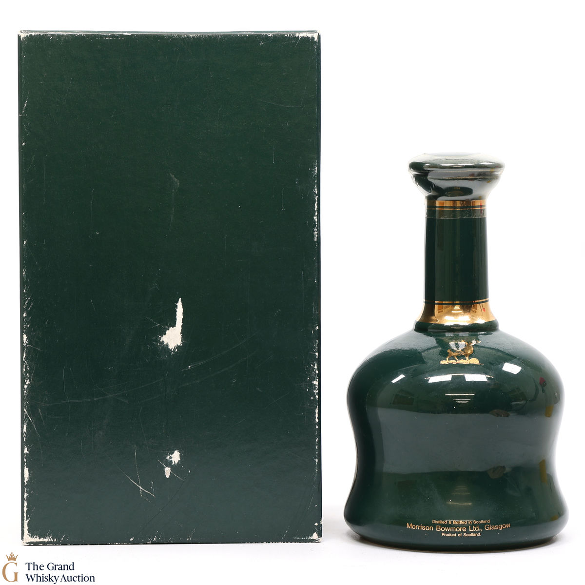 A green, ceramic decanter of Glen Garioch 21-Year-Old produced by Buchan Thistle Ceramics.