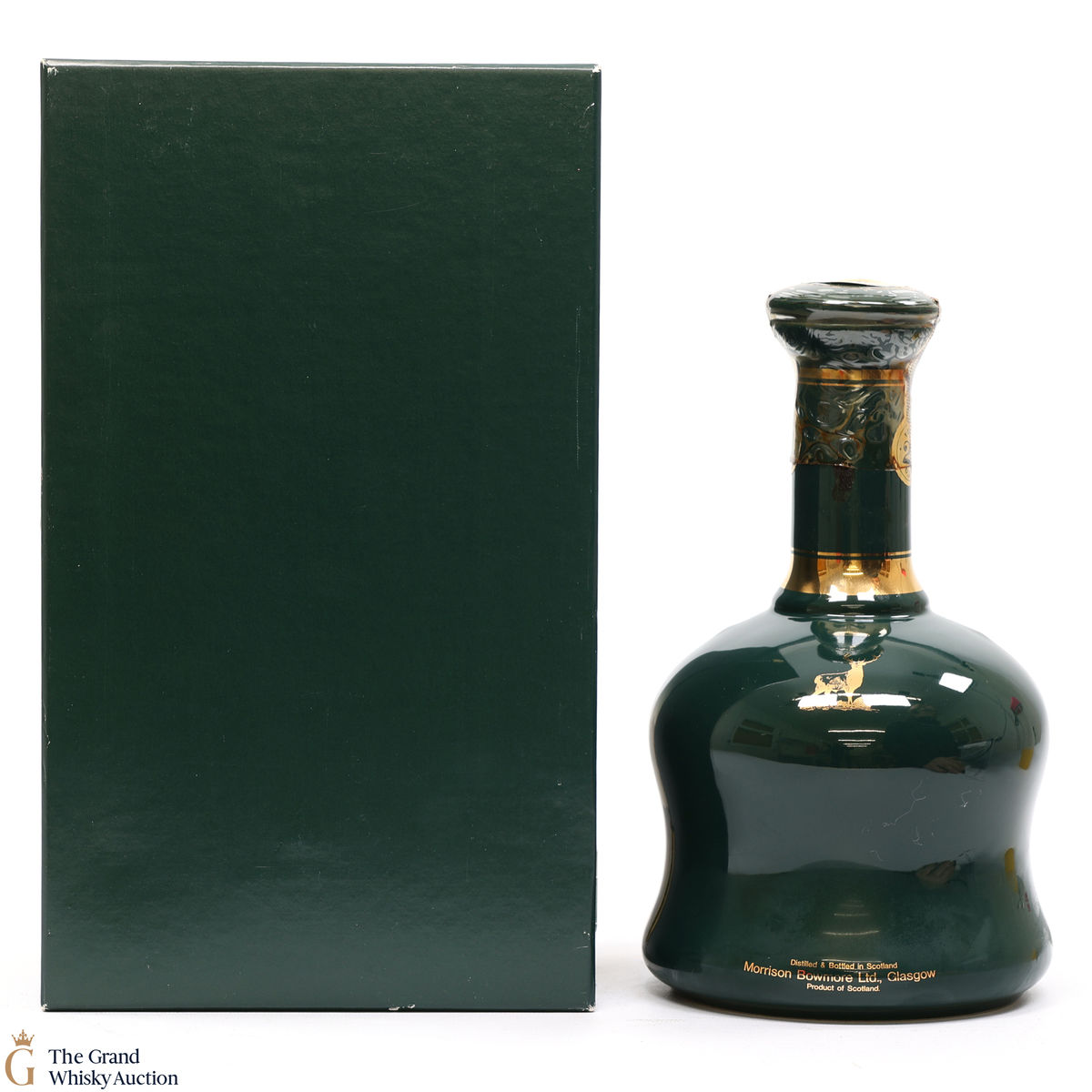 A green, ceramic decanter of Glen Garioch 21-Year-Old produced by Buchan Thistle Ceramics.