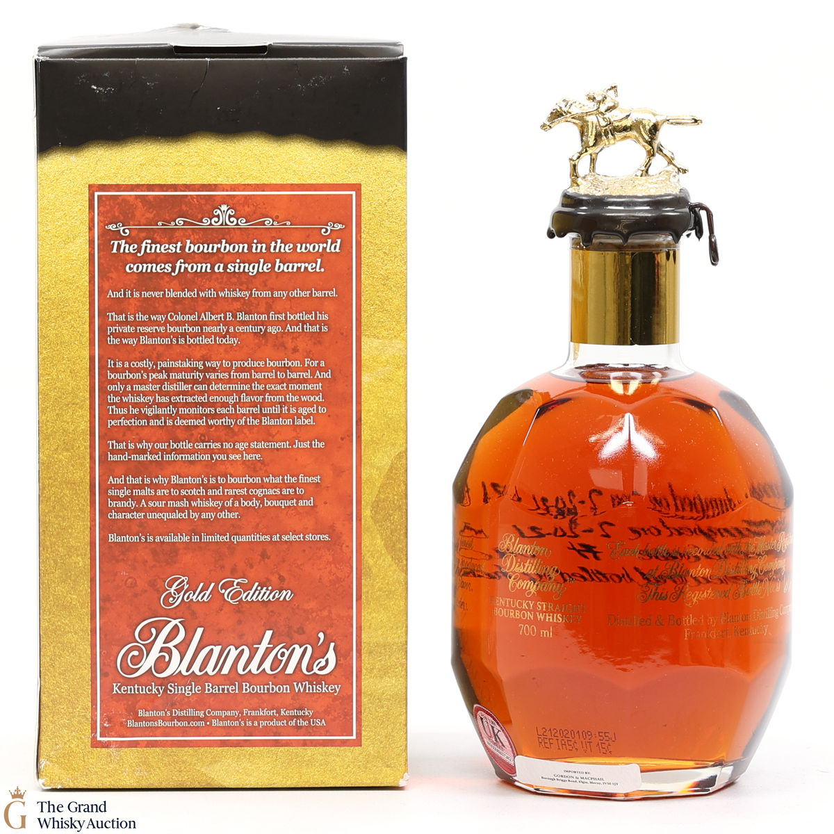 PLEASE NOTE: The wax seal on Blanton's bottles are prone to cracking in transit due to their design. Therefore, as stated in our T&C’s, we do not and will not accept liability should the seal be breached, broken, split or leak in transit. Additionally, please know due to the design of the internal cardboard packaging that surrounds the top of the bottles, it too may be torn. By bidding on this lot you have understood this to be true. Insurance is for complete breakage or loss in transit only.