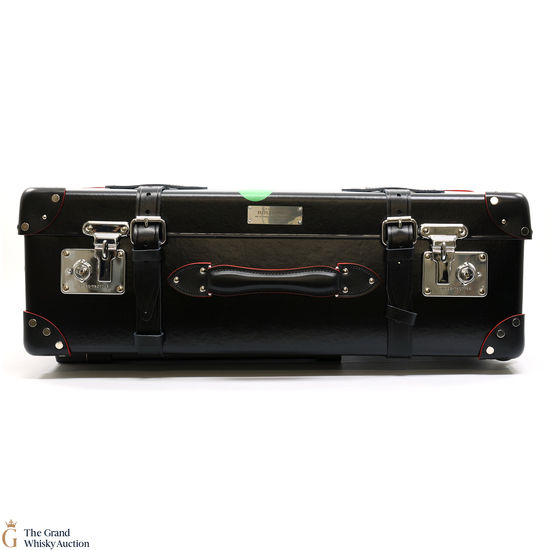 The bottle is presented in a bespoke Globe-Trotter 26” 2-wheel trolley case, handmade by the British luggage makers' in their signature patented vulcanised fibreboard and leather. Lined in a bright red, the case has a special edition Bollinger and 007 plaque inside and out.