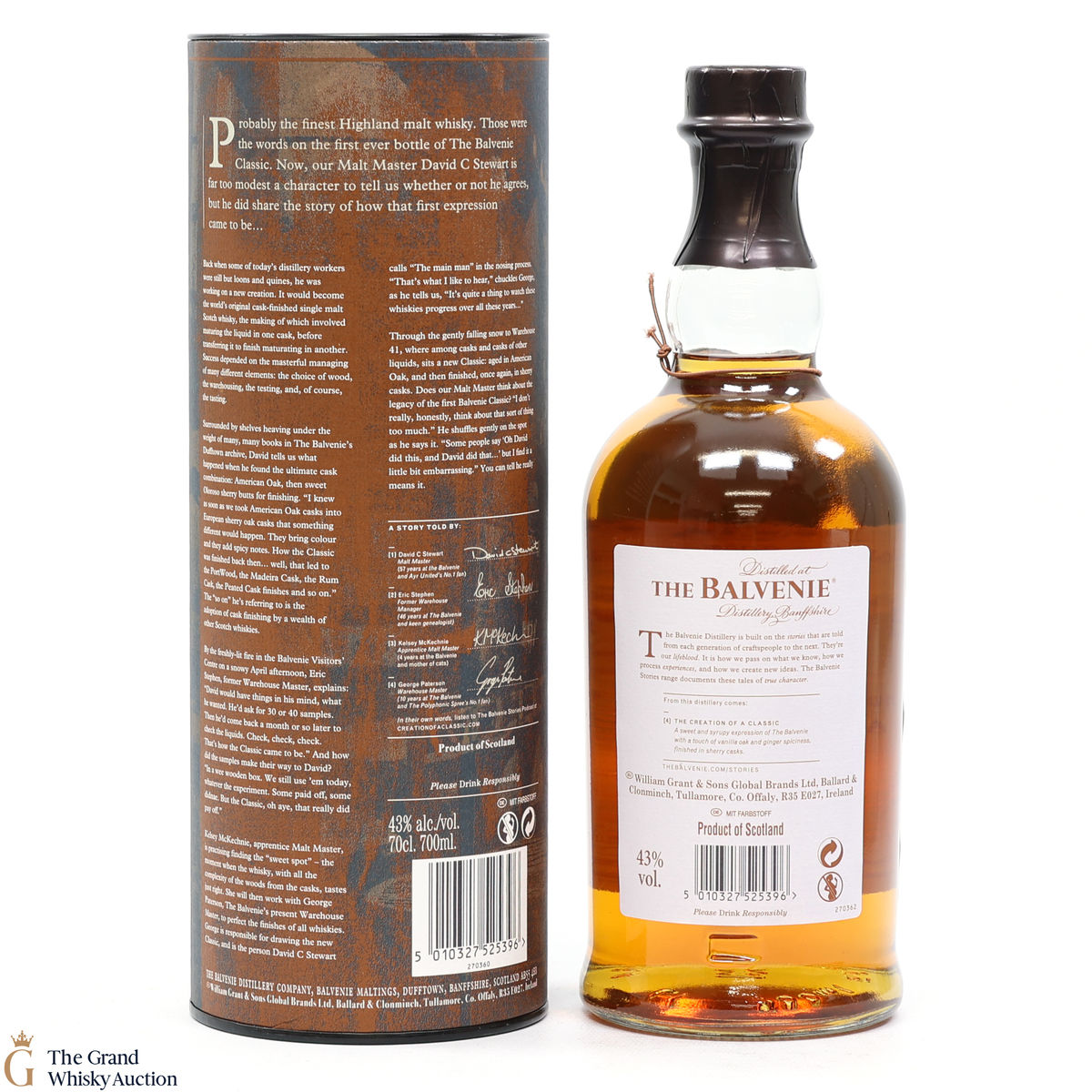 Part of a new trio of whiskies in The Balvenie Stories collection. This no-age-statement whisky pays homage to David Stewart MBE, The Balvenie malt master and longest-serving malt master in the industry. Stewart created the first cask-finished whisky back in the 1980s with The Balvenie Classic. The Creation of the Classic has been matured in American oak casks and finished in oloroso Sherry casks.