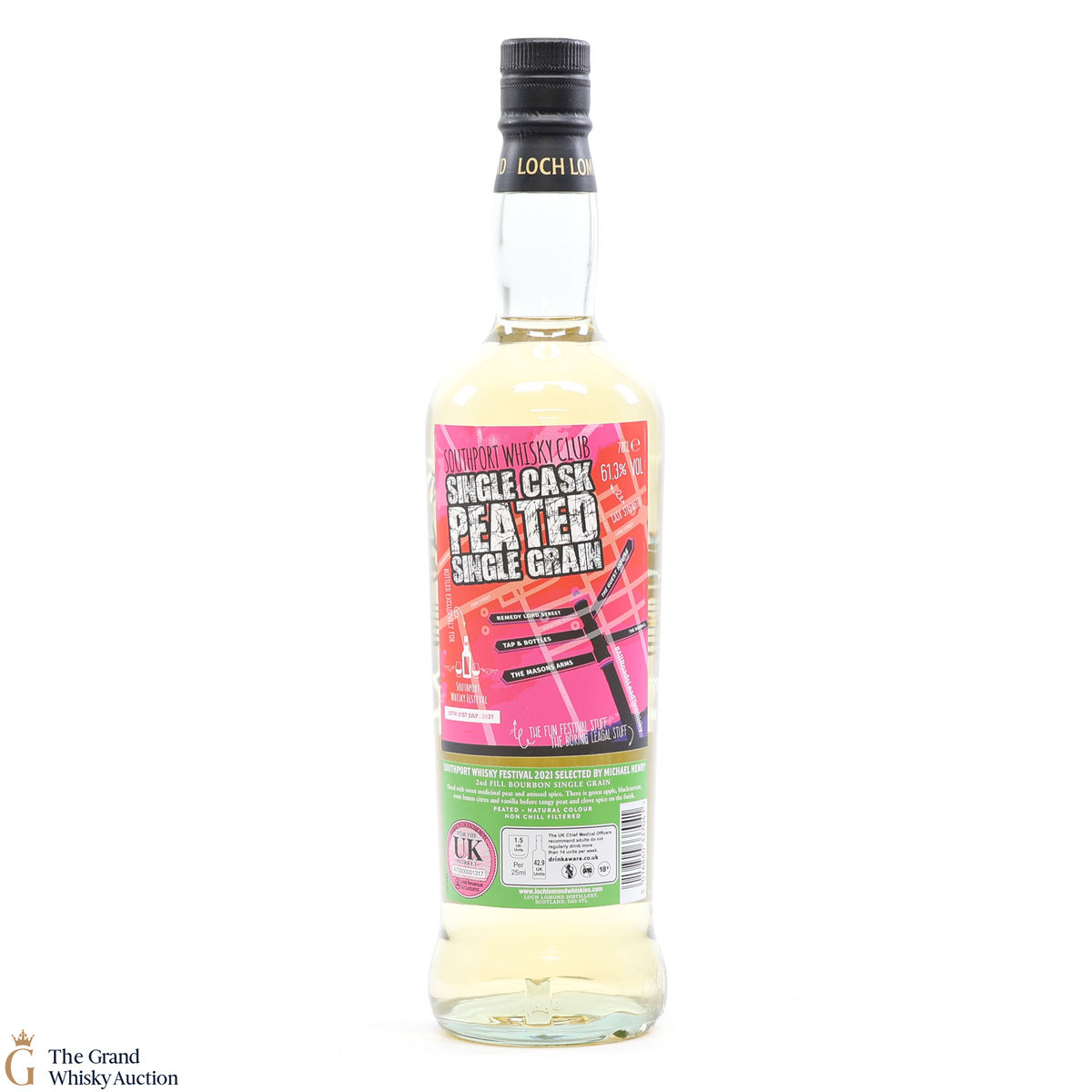 This Peated Single Grain from Loch Lomond was selected by Michael Henry and bottled exclusively for the Southport Whisky Festival 2021. Distilled in April 2017, matured in cask #730, a 2nd fill ex-bourbon, and bottled at natural colour and non-chill filtered in June 2021 at cask strength, 61.3% ABV. This is one of 247 bottles.
