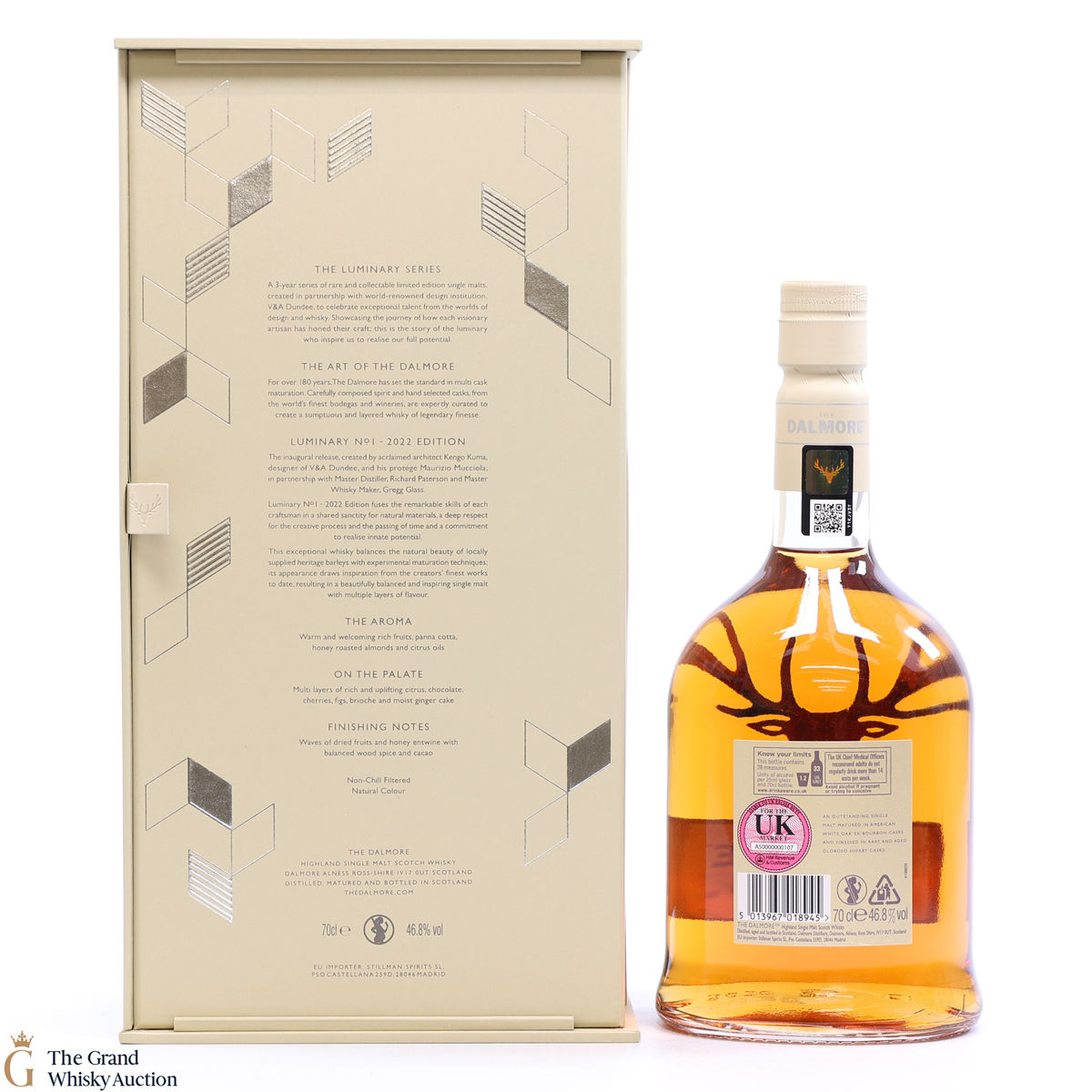 Dalmore is working with architect Kengo Kuma and protégé Maurizio Mucciola to create this single malt. This single malt has spent a total of 15 years ageing in both Italian Amarone red wine casks, virgin "Kintsugi" casks from the Tay and finally Japanese and American white oak before.
