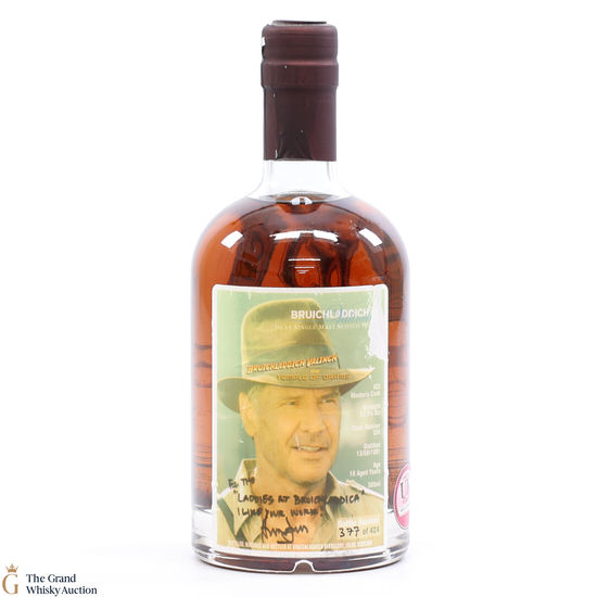 On the label there is a photo of Indiana Jones with the quote " Laddies at Bruichladdich, I like your work!"
