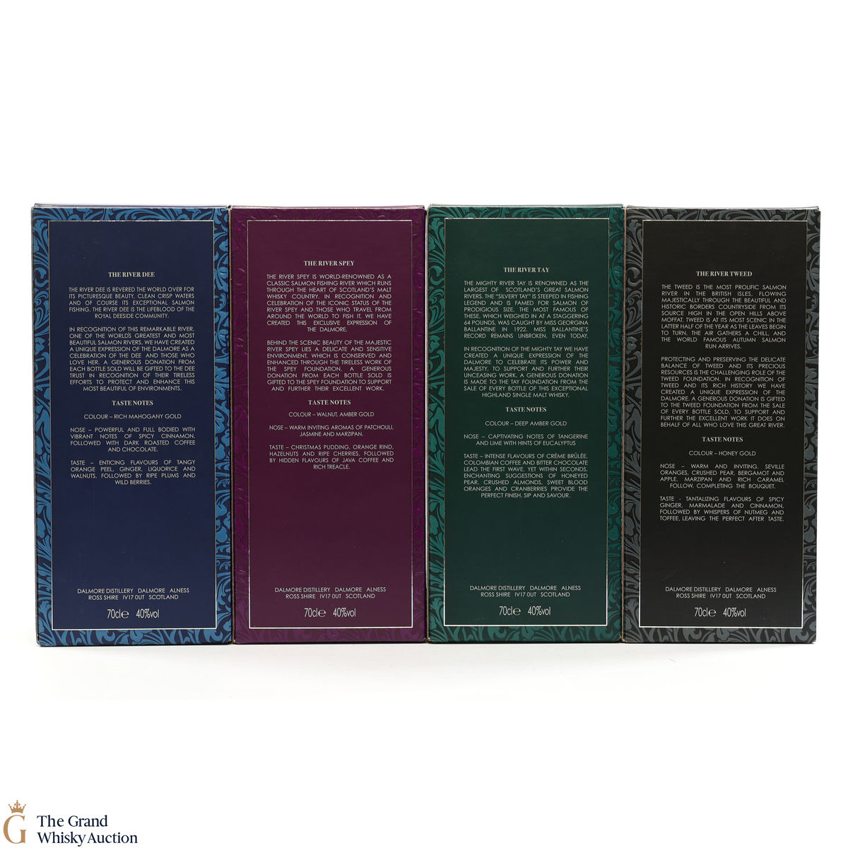 The Dalmore Rivers Collection includes four bottlings named after four famous Scottish Salmon rivers, The Dee, The Spey, The Tweed and The Tay. Each expression was bottled at 40%. This lot includes 4 x 70cl bottlings.
