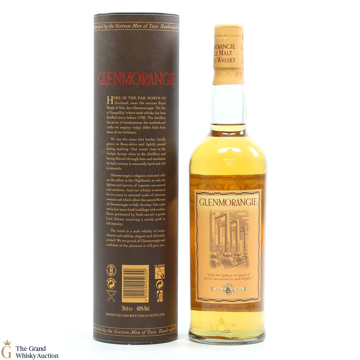 An older style bottling of Glenmorangie 10-year-old. Handcrafted by the sixteen men of Tain.