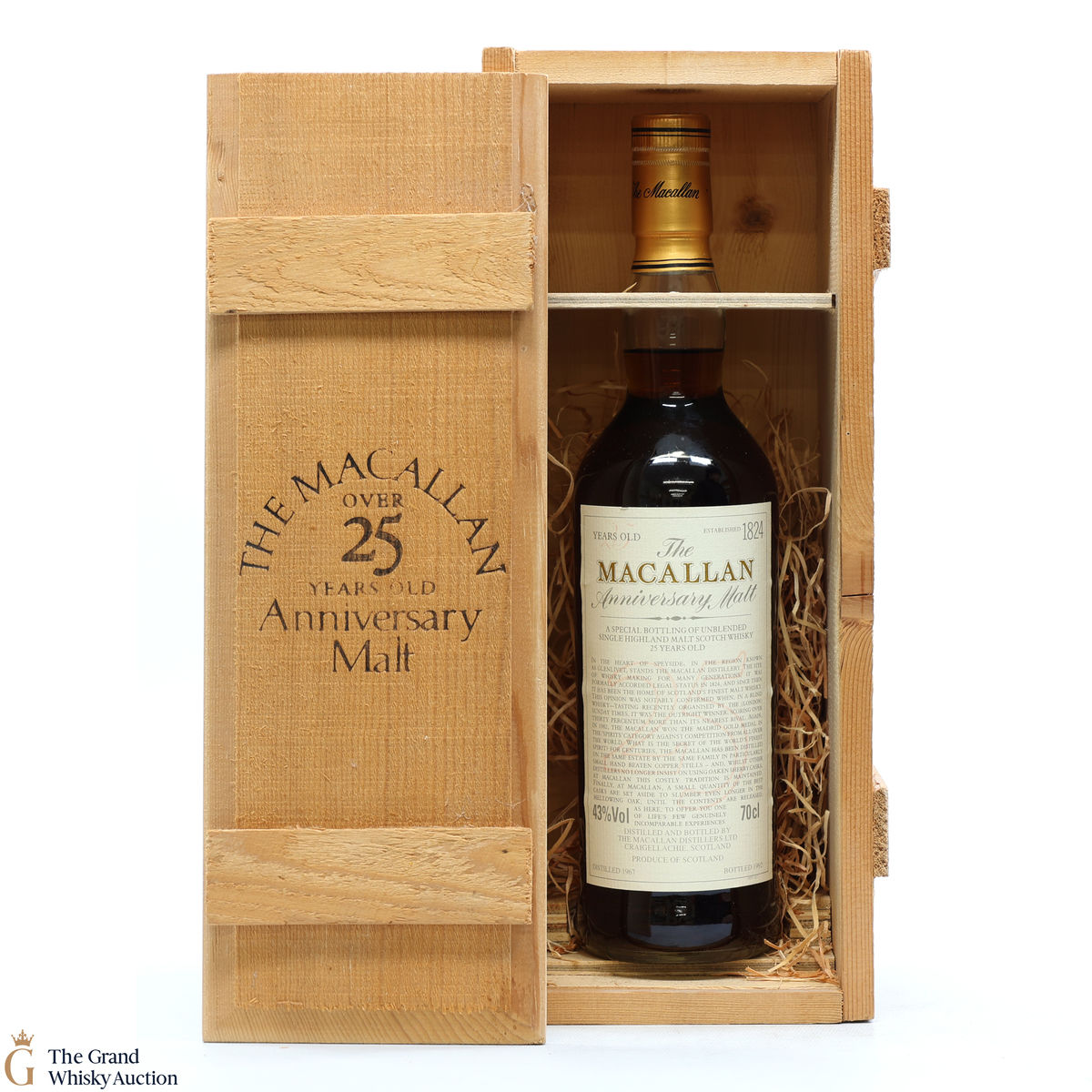This is an incredibly rare 25-year-old Speyside single malt. It was distilled at The Macallan in 1967. It was bottled for the UK market in 1992 for the highly decorated Anniversary Malt range.