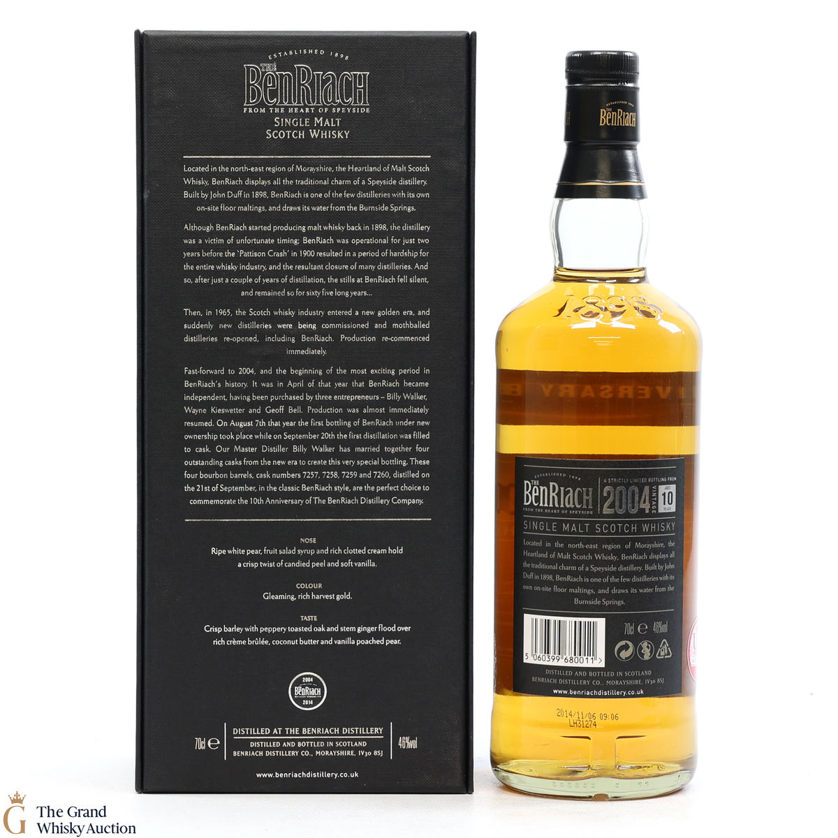 A 10-year-old Benriach to commemorate the 10th anniversary of the reopening of the distillery by Billy Walker. Created exclusively from Benriach distilled during the very first week of production under independent ownership from four ex-bourbon barrels filled on 21 September 2004.