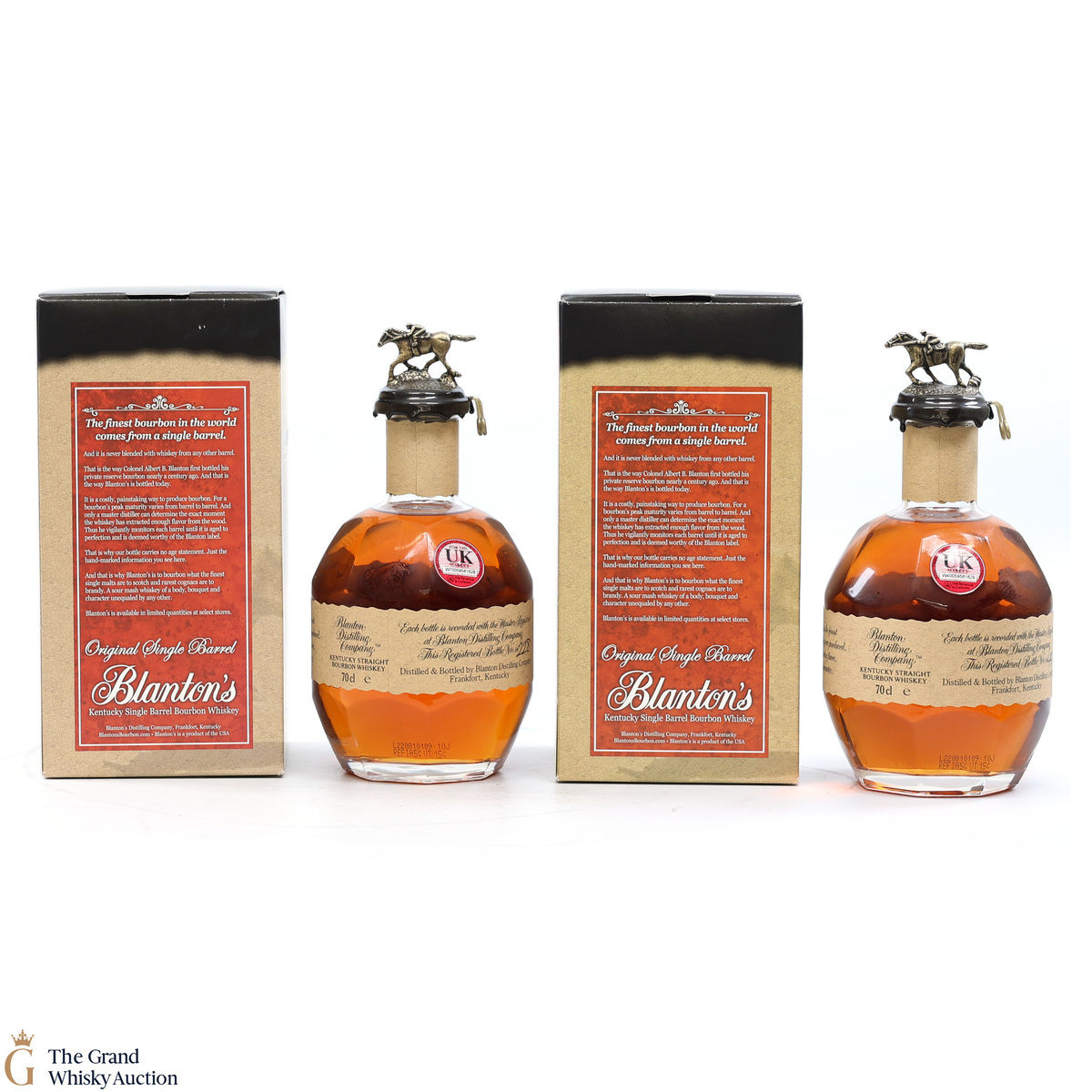 PLEASE NOTE: The wax seal on Blanton's bottles are prone to cracking in transit due to their design. Therefore, as stated in our T&C’s, we do not and will not accept liability should the seal be breached, broken, split or leak in transit. Additionally, please know due to the design of the internal cardboard packaging that surrounds the top of the bottles, it too may be torn. By bidding on this lot you have understood this to be true. Insurance is for complete breakage or loss in transit only.
