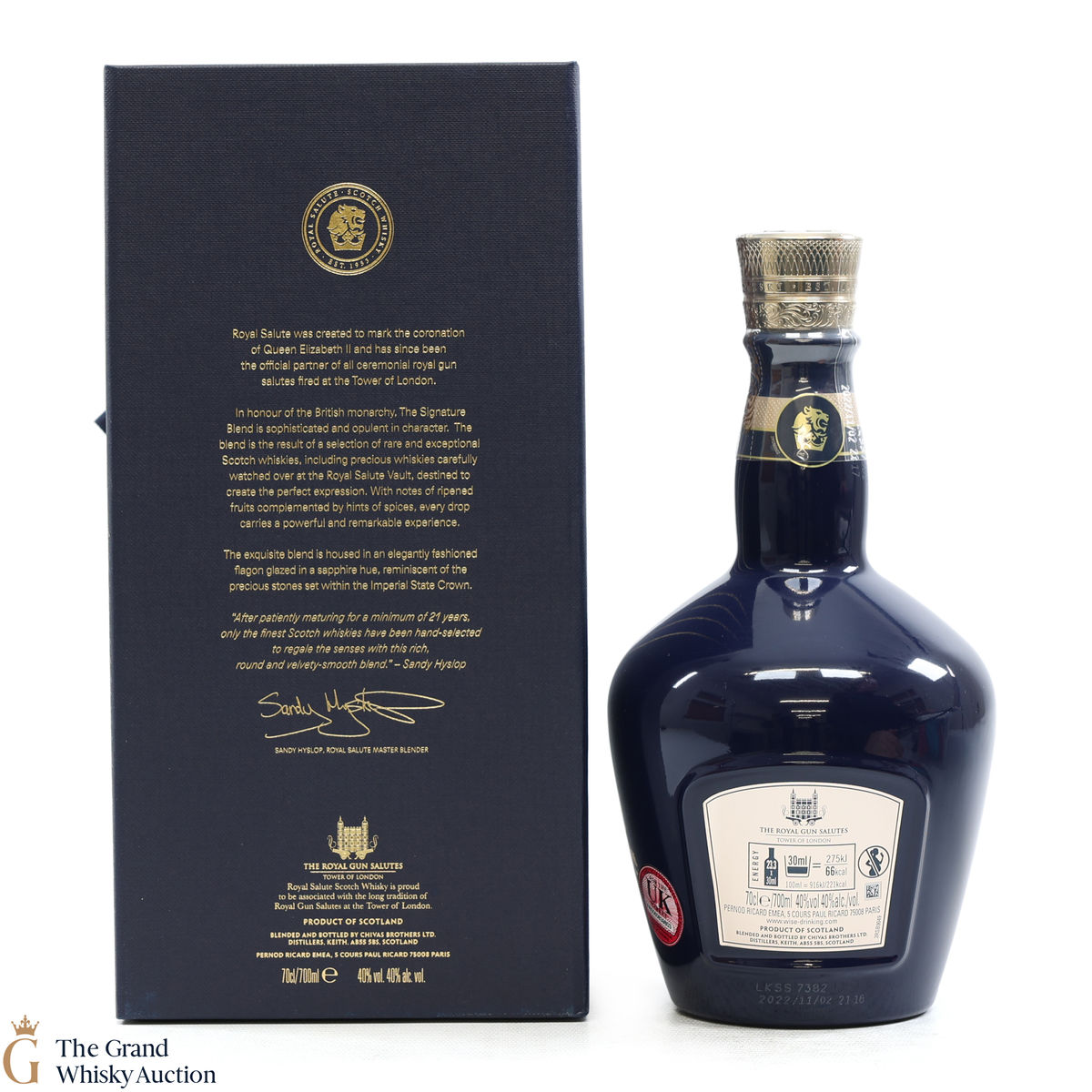 This is a special Sapphire-coloured edition of Chivas' Royal Salute 21 Year Old blended whisky from the Chivas Royal Salute Range.