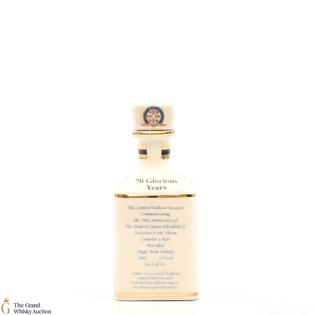 A mini decanter commemorating the 70th Anniversary of Her Majesty Queen Elizabeth II Accession to the Throne. Filled with a rare Macallan, there were only 70 full sets released which consisted of 70 different bottles.