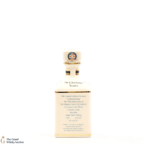 A mini decanter commemorating the 70th Anniversary of Her Majesty Queen Elizabeth II Accession to the Throne. Filled with a rare Macallan, there were only 70 full sets released which consisted of 70 different bottles.