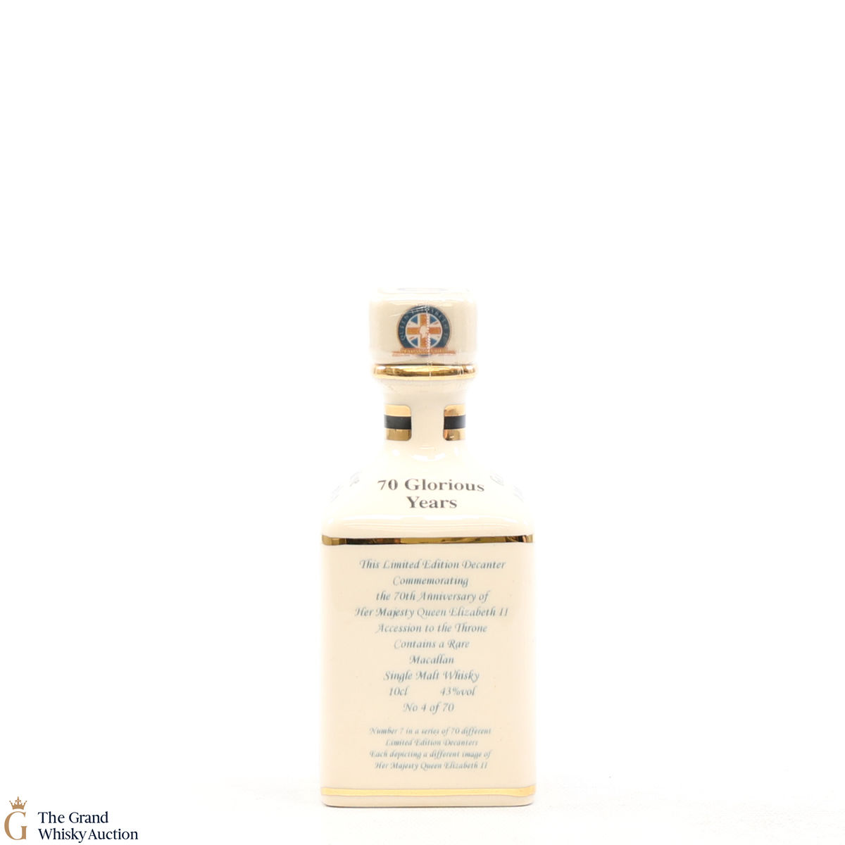 A mini decanter commemorating the 70th Anniversary of Her Majesty Queen Elizabeth II Accession to the Throne. Filled with a rare Macallan, there were only 70 full sets released which consisted of 70 different bottles.