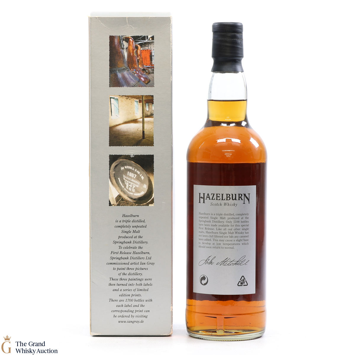 This 8-year old Hazelburn which is a triple distilled, completely unpeated single malt produced at Campbeltown's Springbank Distillery. To celebrate the First Release Hazelburn, Springbank Distillers Ltd commissioned artist Ian Gray to paint 3 pictures of the distillery. The 3 paintings were then turned into both labels and a series of limited edition prints.