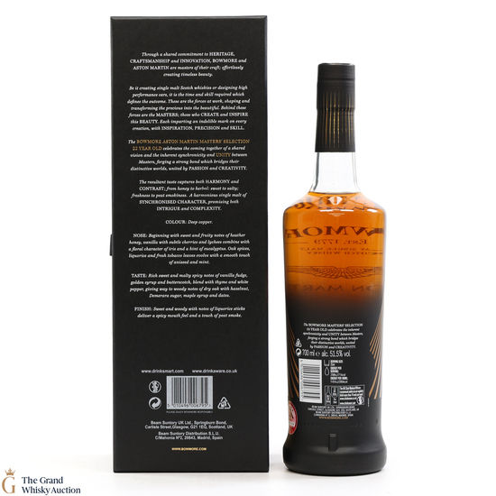 This 22-Year-Old Bowmore is a limited-edition single malt created in collaboration between Ron Welsh, Bowmore Master Blender, and Marek Reichman, Aston Martin Chief Creative Officer. Matured in a combination of American oak hogsheads and sherry butts. The result is a single malt that thrills all the senses for optimal enjoyment.