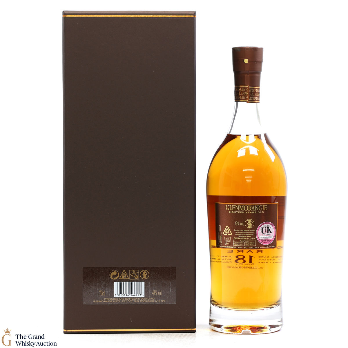 This bottle is an 18-year-old Extremely Rare, Highland single malt produced by Glenmorangie. It has been perfected by the sixteen men of Tain who have specially aged this bottle for 18 years in superior oak casks.