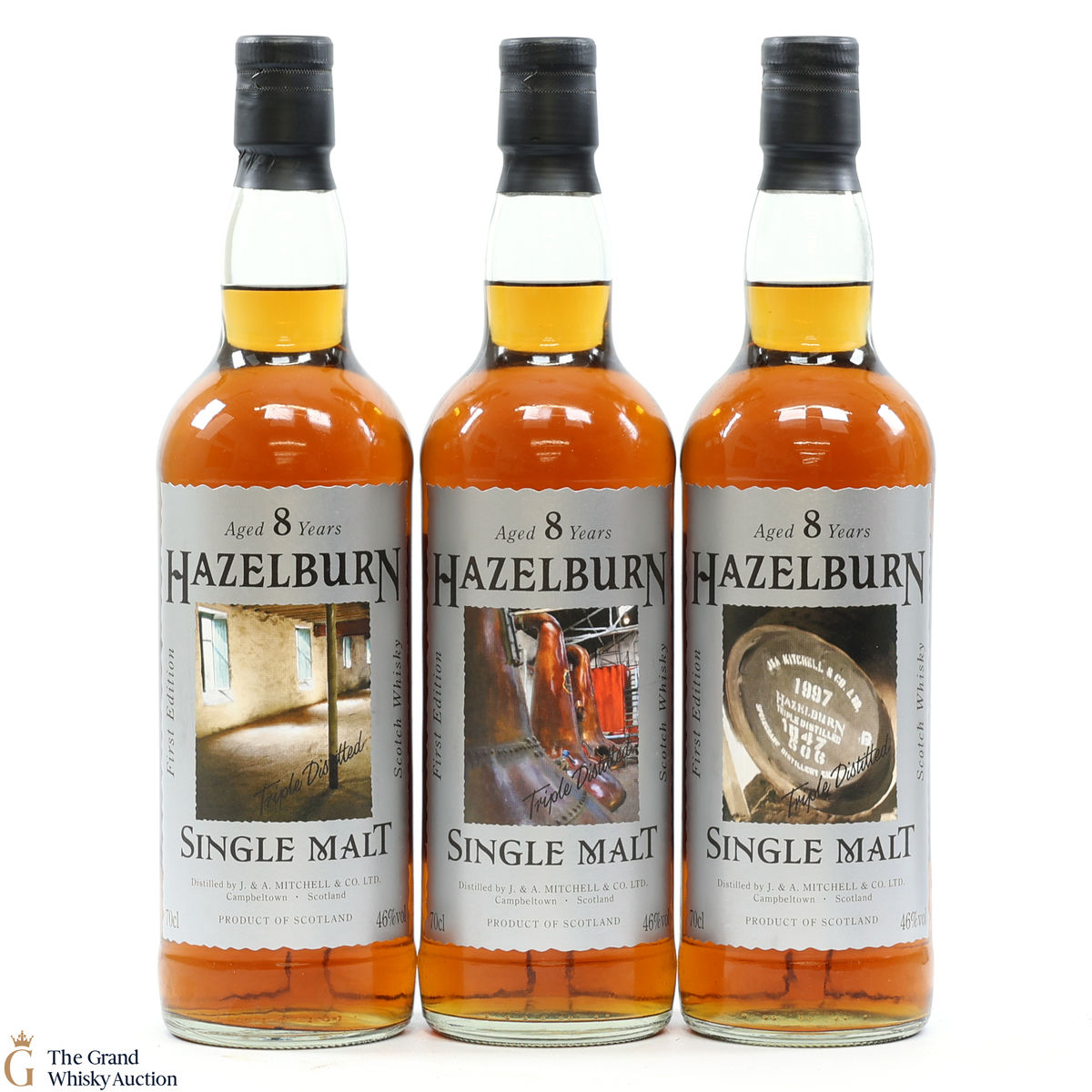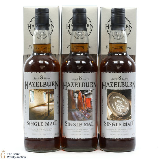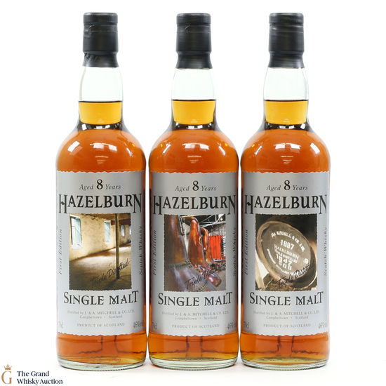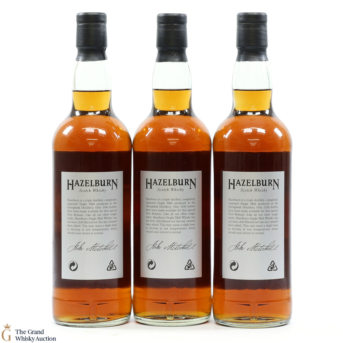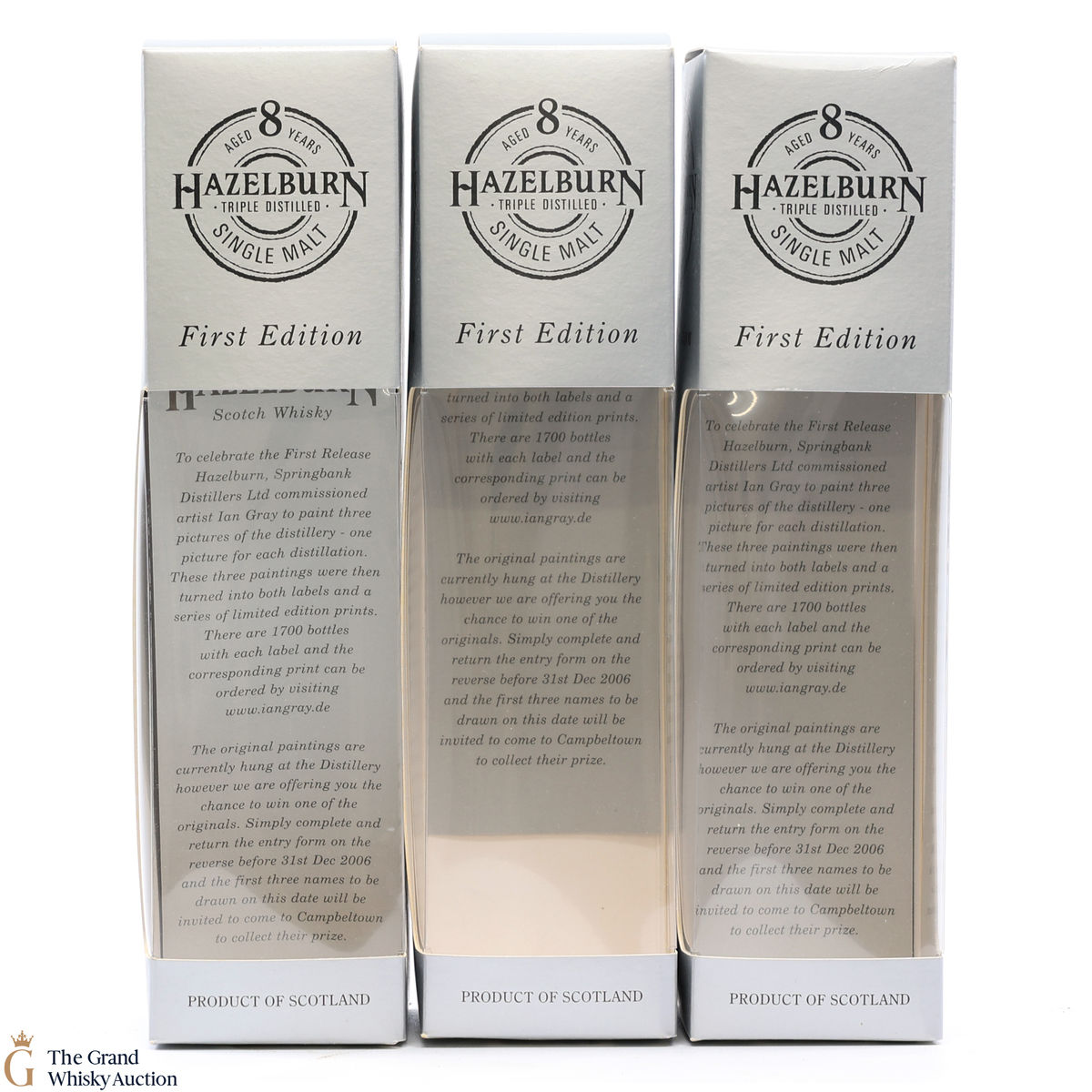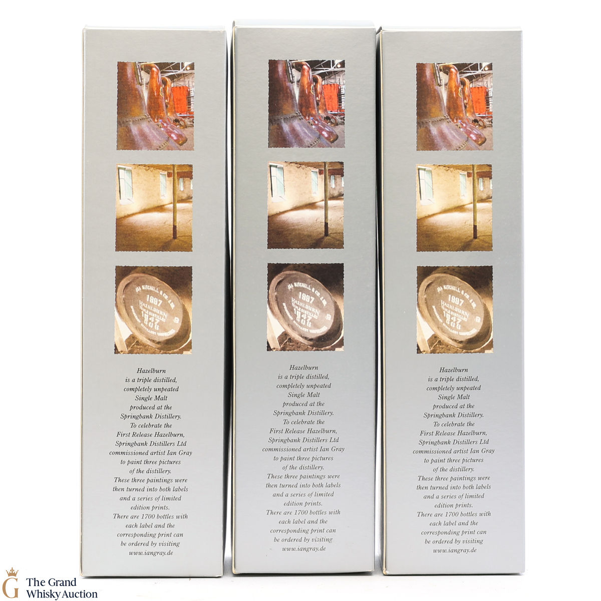 This lot has 3 x 70cl bottles of Hazelburn which is a triple distilled, completley unpeated single malt produced at Campeltown's Springbank Distillery. To celebrate the First Release Hazelburn, Springbank Distillers Ltd commissioned artist Ian Gray to paint 3 pictures of the distillery. These 3 paintings were then turned into both labels and a series of limited edition prints.