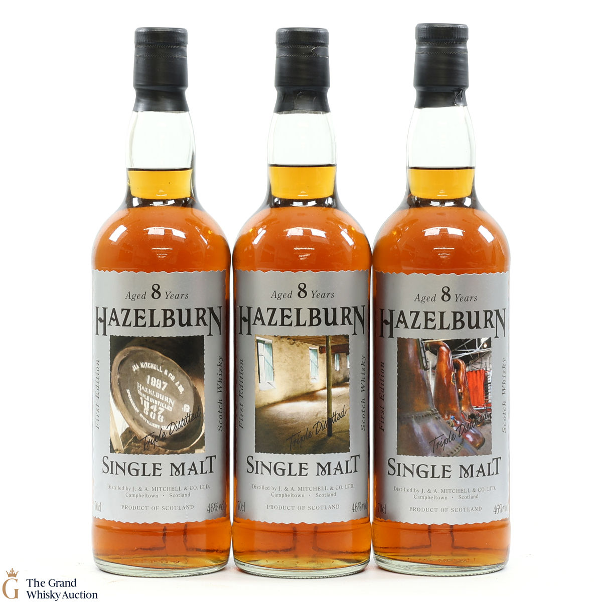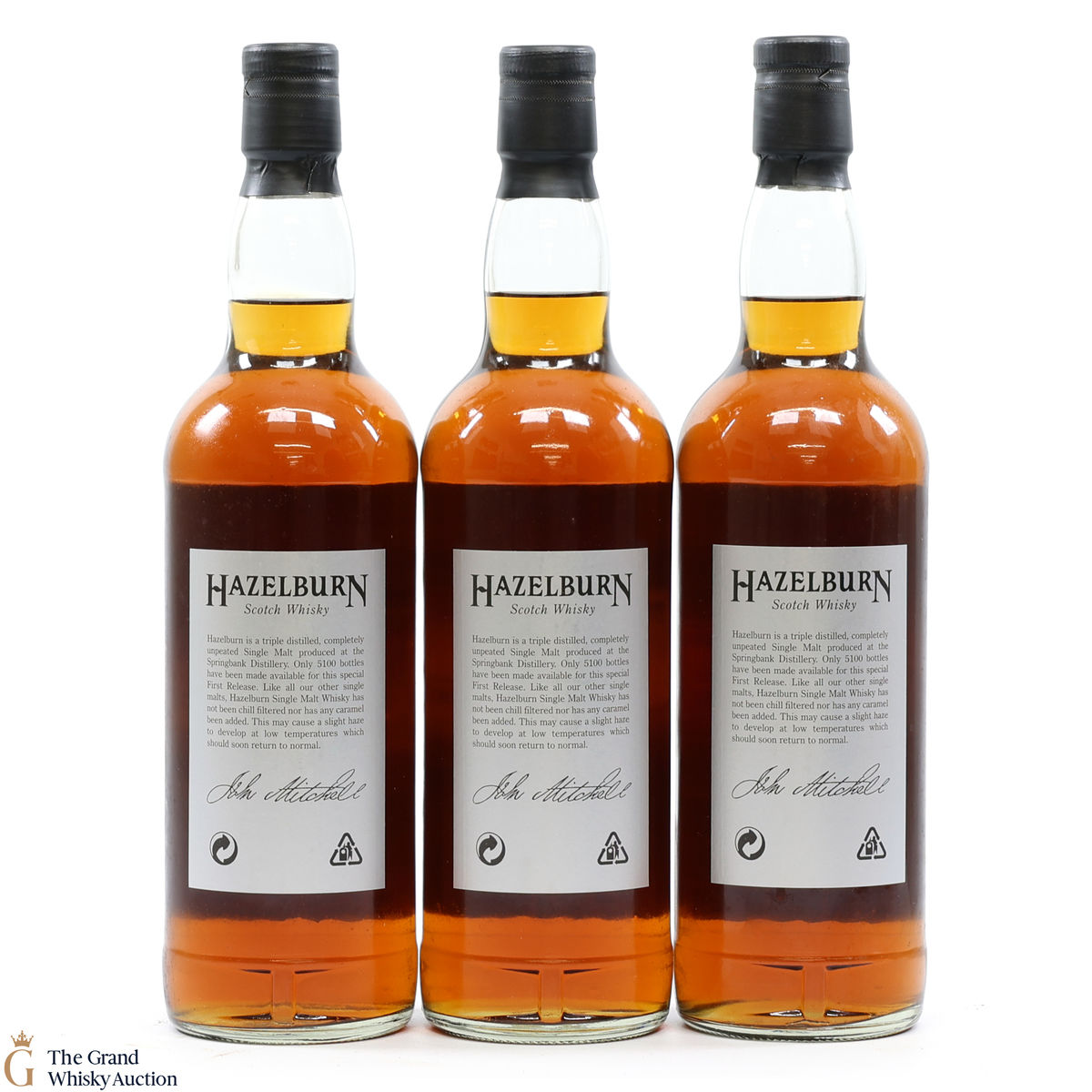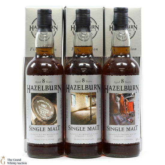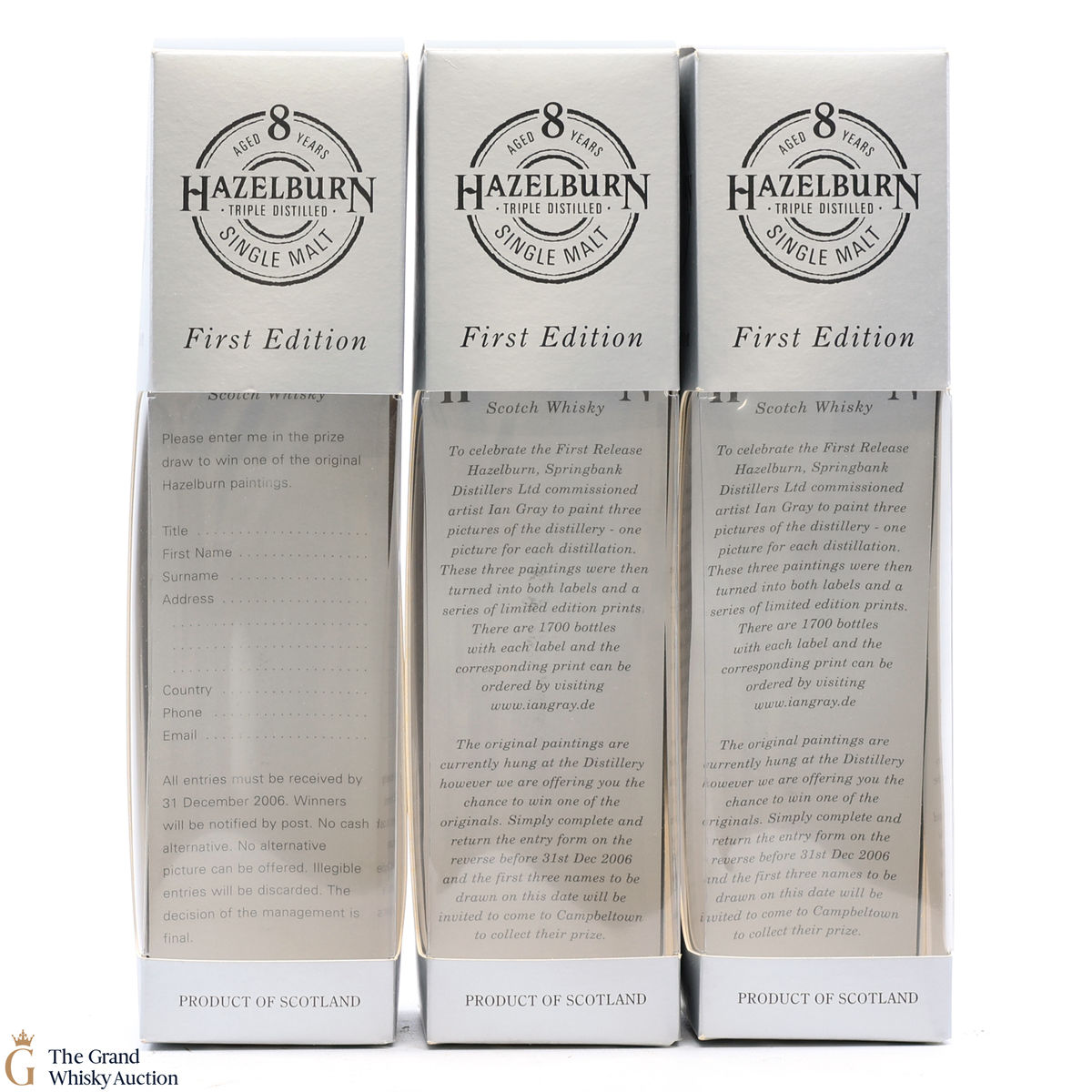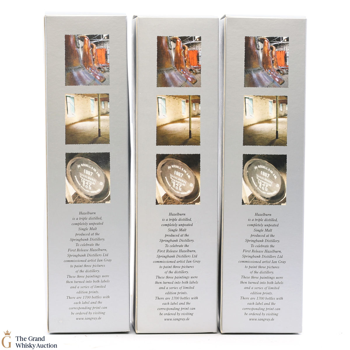 This lot has 3 x 70cl bottles of Hazelburn which is a triple distilled, completley unpeated single malt produced at Campeltown's Springbank Distillery. To celebrate the First Release Hazelburn, Springbank Distillers Ltd commissioned artist Ian Gray to paint 3 pictures of the distillery. These 3 paintings were then turned into both labels and a series of limited edition prints.