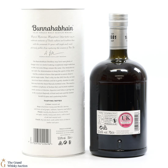 For Feis Ile 2021, Bunnahabhain Distillery released this unique bottling. Distilled back on the 8th of October 2001, this single malt was finished in a cask that once held Marsala fortified wine resulting in a combination of Sicilian flair and Scottish tradition. Bottled on the 19th of January 2021, this is one of only 1333 bottles produced.