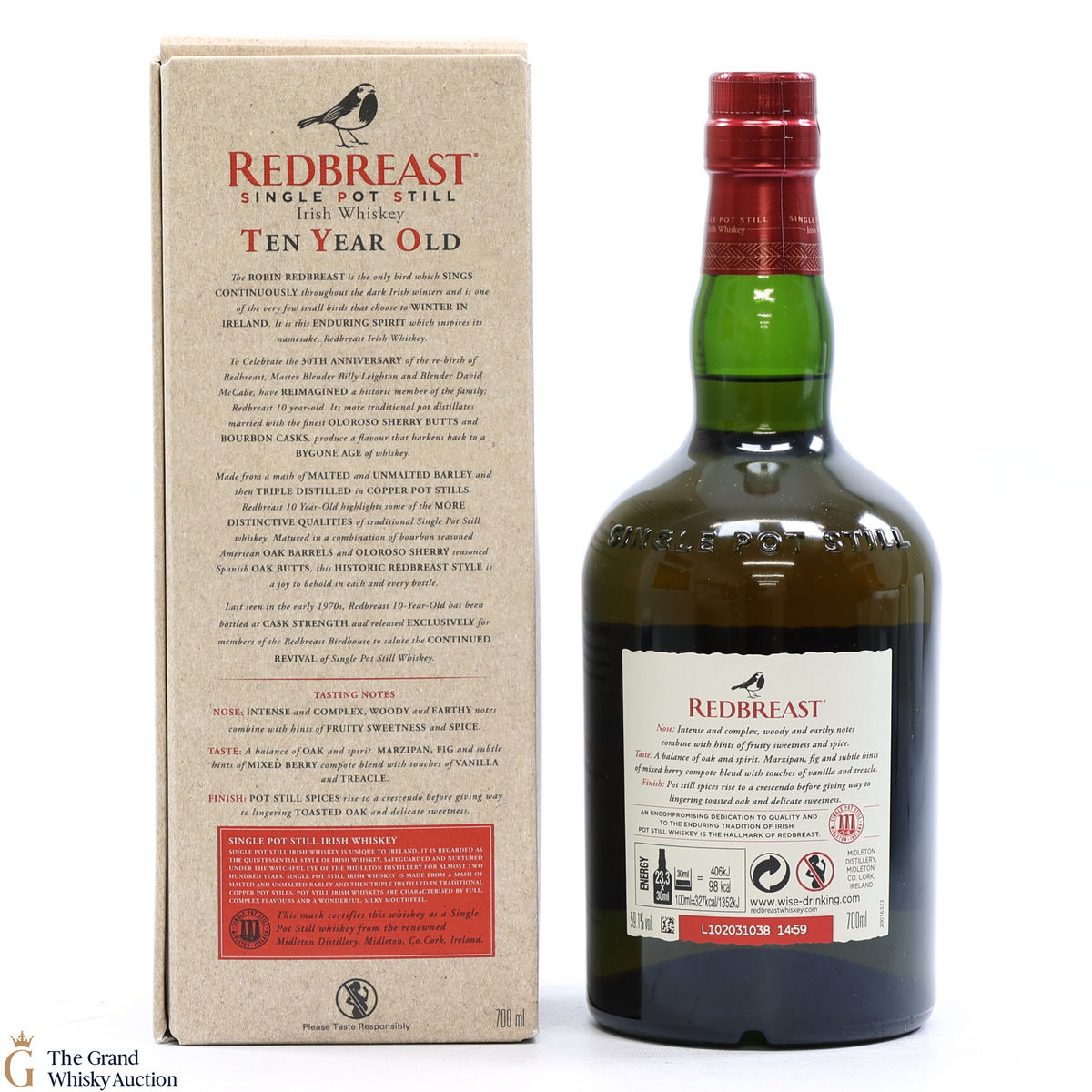 Redbreast 10 Year Old is a Bird House Exclusive bottling to celebrate the 30th anniversary of the re-birth of the Redbreast. Matured in a combination of bourbon-seasoned American oak barrels and Oloroso sherry seasoned Spanish oak butts before being bottled at a cask strength of 59.1% ABV is from batch 1.