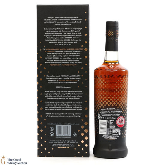 This 21-Year-Old Bowmore is a limited-edition single malt created in collaboration between Ron Welsh, Bowmore Master Blender and Marek Reichman, Aston Martin Chief Creative Officer. Matured in a combination of oloroso and Pedro Ximenez sherry casks. The result is a single malt that thrills all the senses for optimal enjoyment.