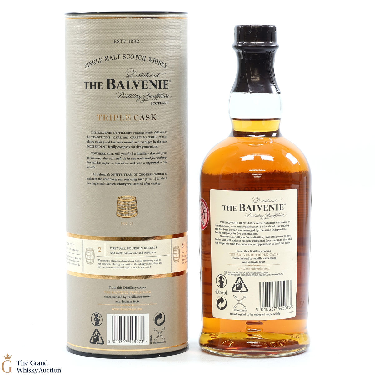 The Balvenie Triple Cask is a single malt Scotch whisky from this renowned Speyside based distillery. Matured in American oak barrels, traditional refill casks and first-fill Oloroso sherry butts, this single malt has a complex taste yet brings a great balance of fruit and vanilla.