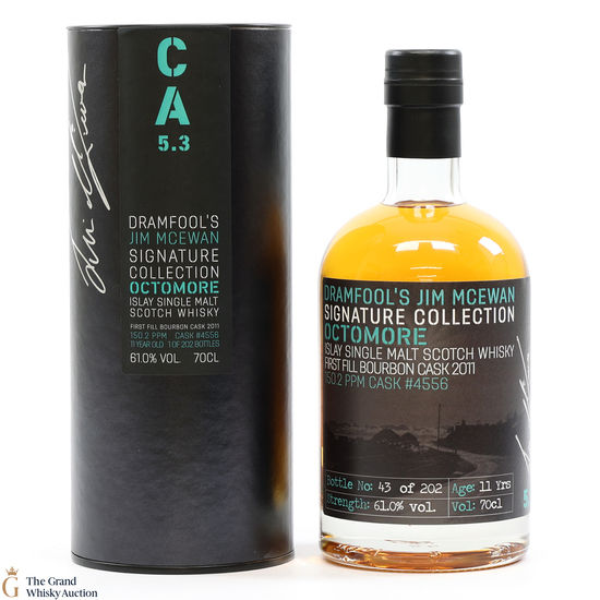 This Octomore single malt was matured in first-fill bourbon barrel #4556 for 11 years until it was bottled as part of Jim McEwan's Signature Collection with Dramfool. This is one of only 202 bottles produced.